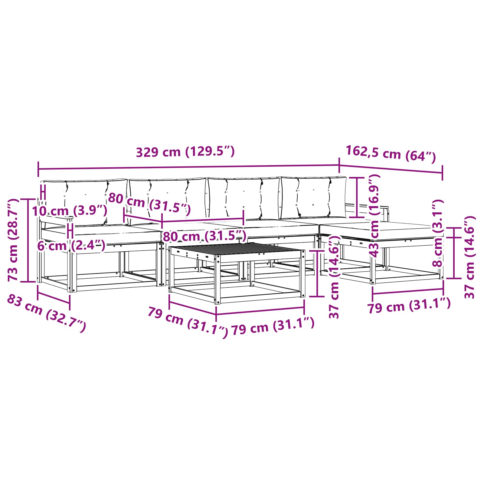 - 5 x Sedežna blazina: 80 x 80 x 8 cm (D x Š x V)