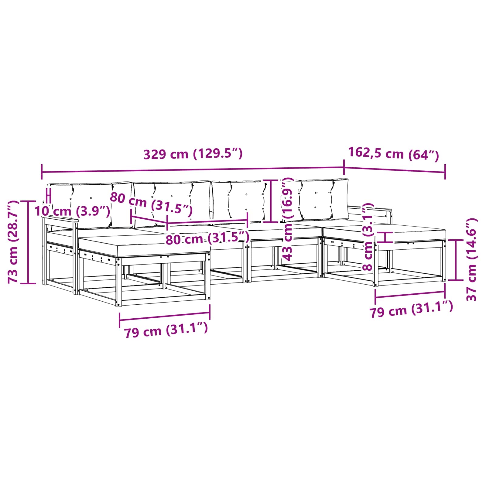 - 6 x Sedežna blazina: 80 x 80 x 8 cm (LxWxH)