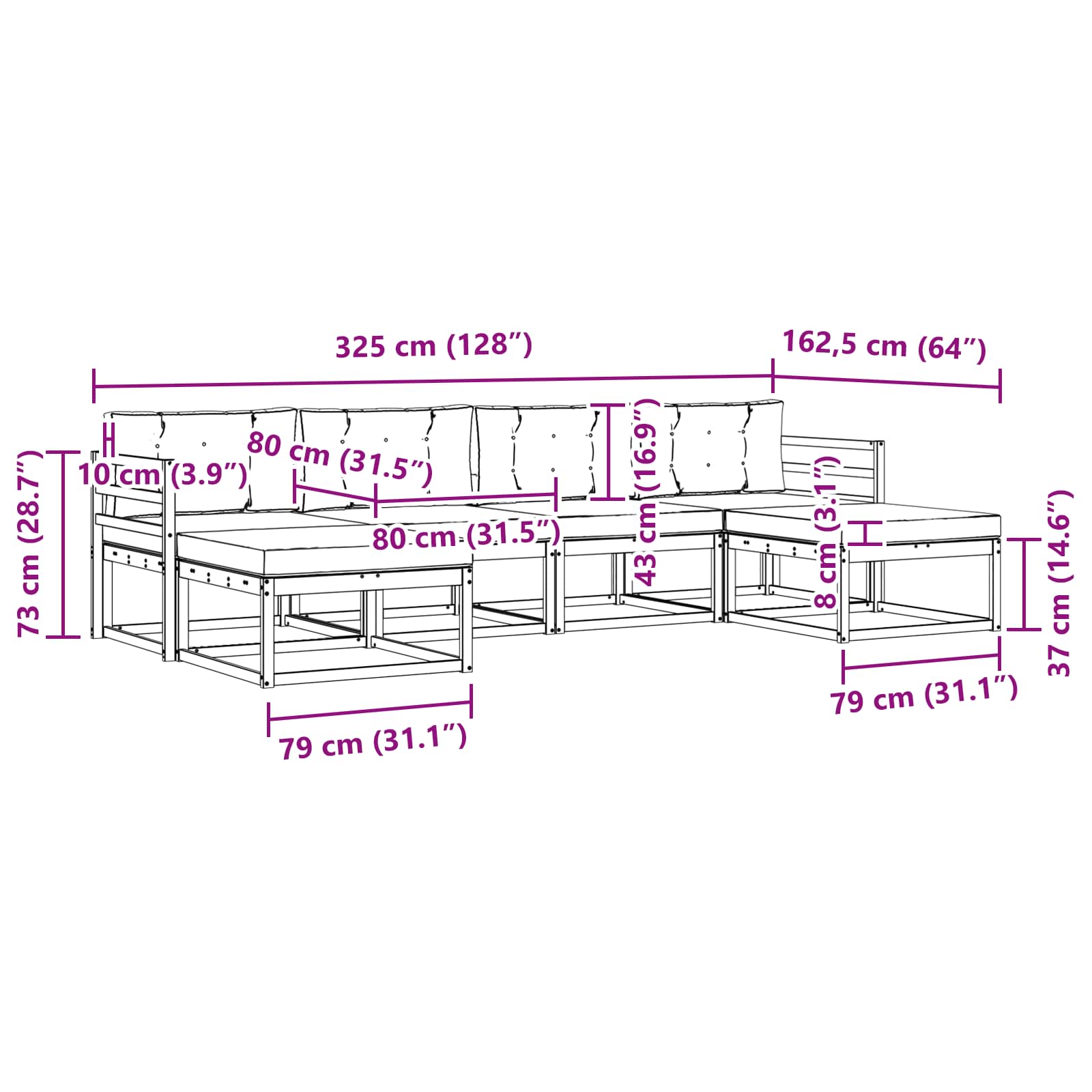 - 6 x Sedežna blazina: 80 x 80 x 8 cm (D x Š x V)