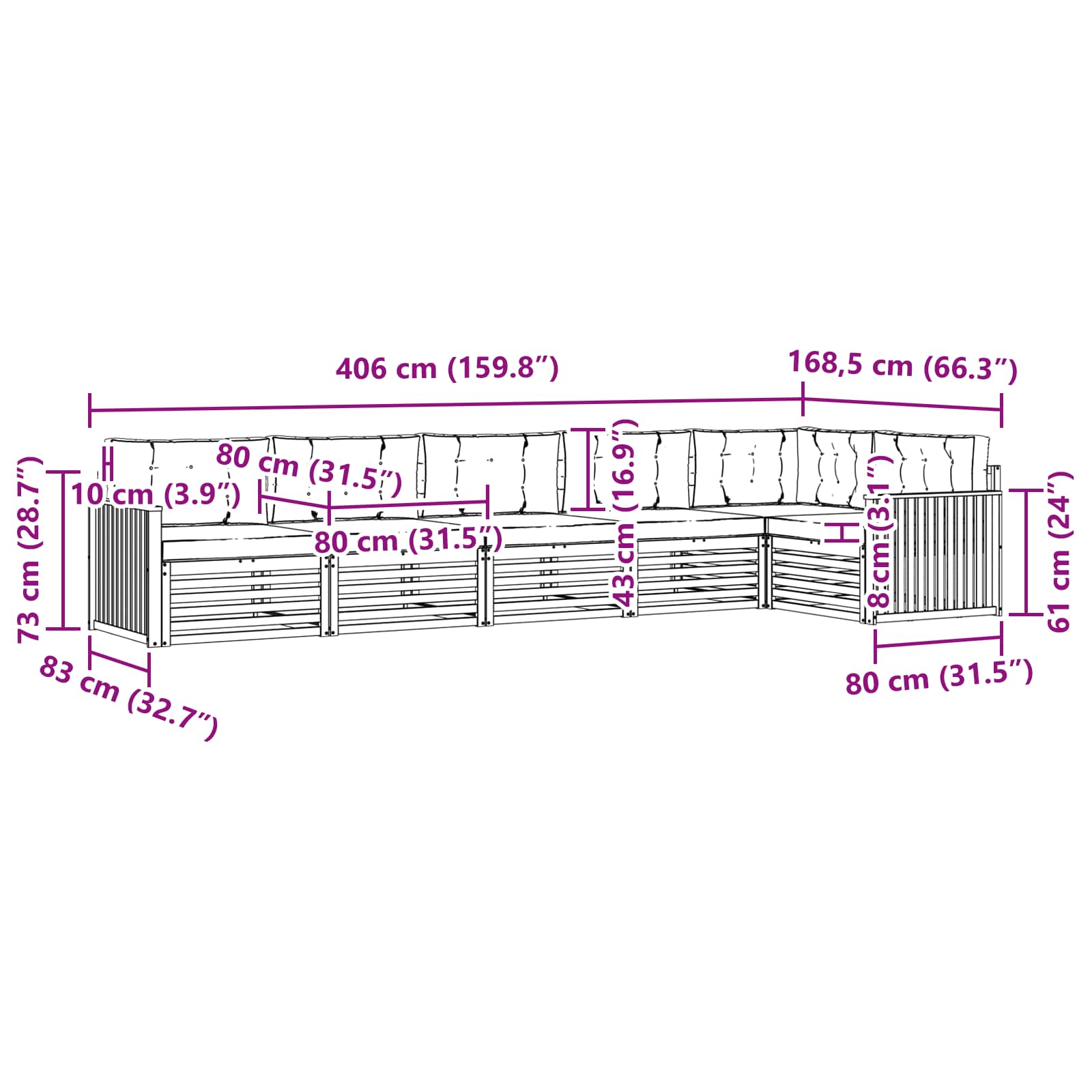 - 6 x sedežna blazina: 80 x 80 x 8 cm (DxŠxV)