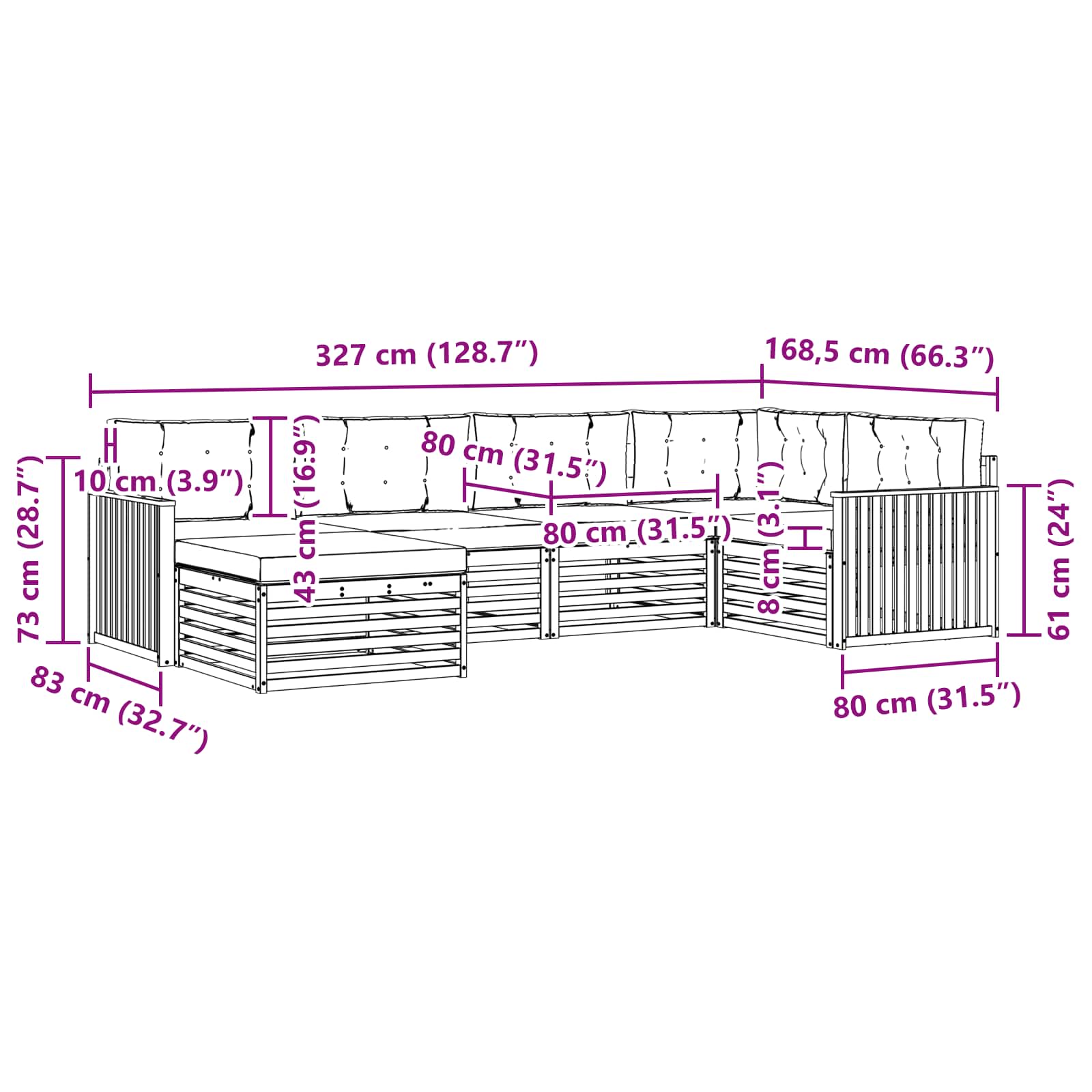 - 6 x sedežna blazina: 80 x 80 x 8 cm (DxŠxV)
