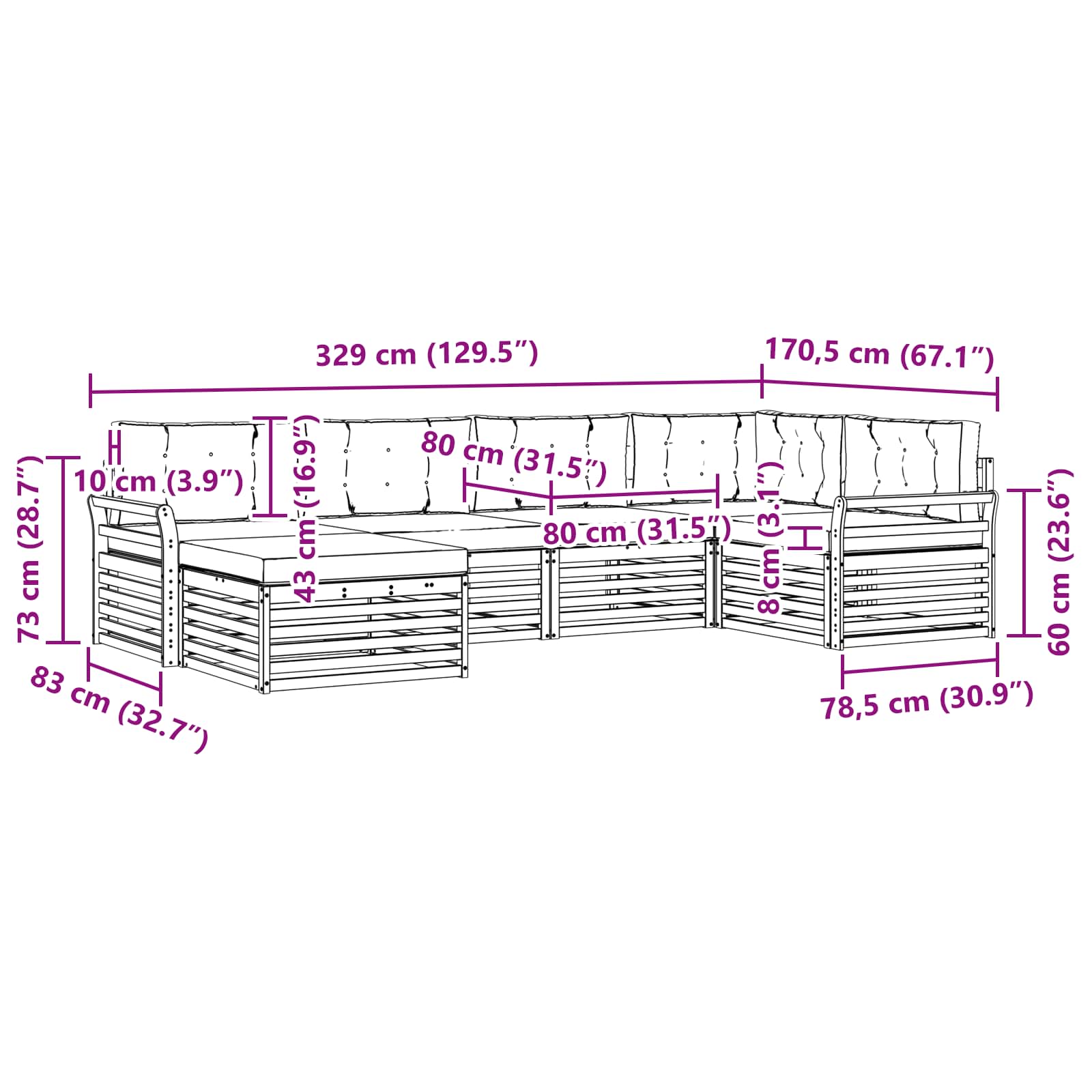 - 6 x sedežna blazina: 80 x 80 x 8 cm (D x Š x V)