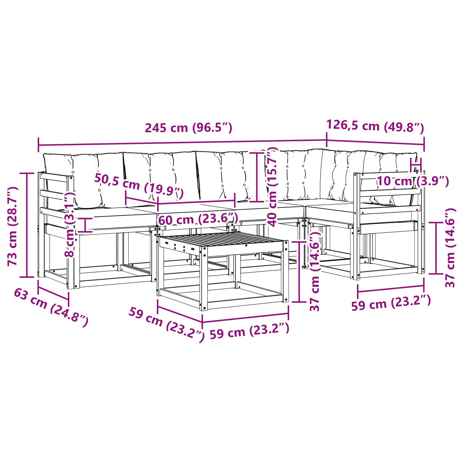 - 6 x Blazina za hrbet: 60 x 40 x 10 cm (ŠxVxD)