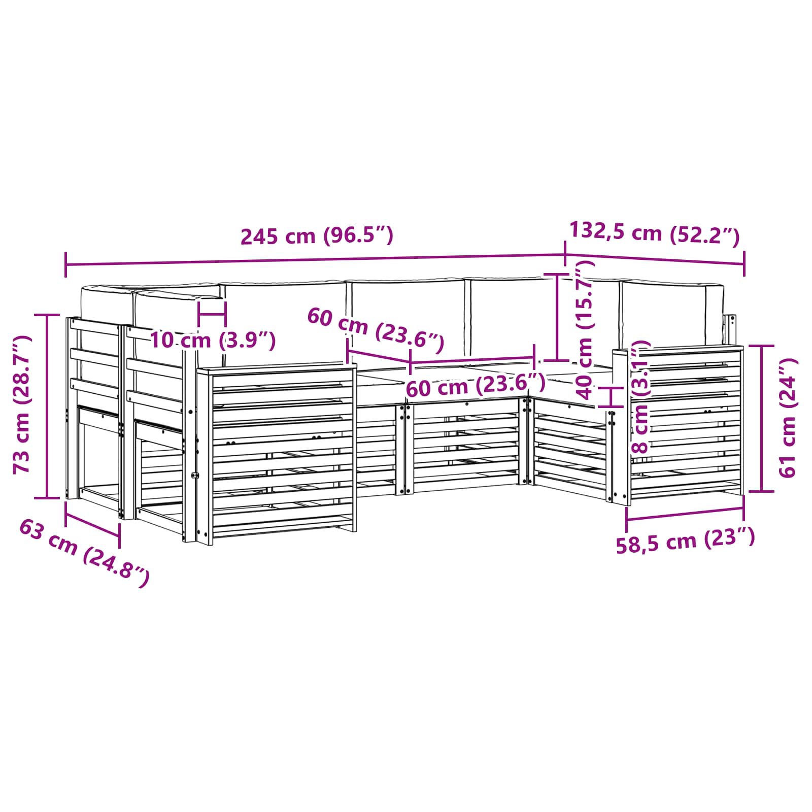 - 6 x Sedežna blazina: 60 x 60 x 8 cm (D x Š x V)