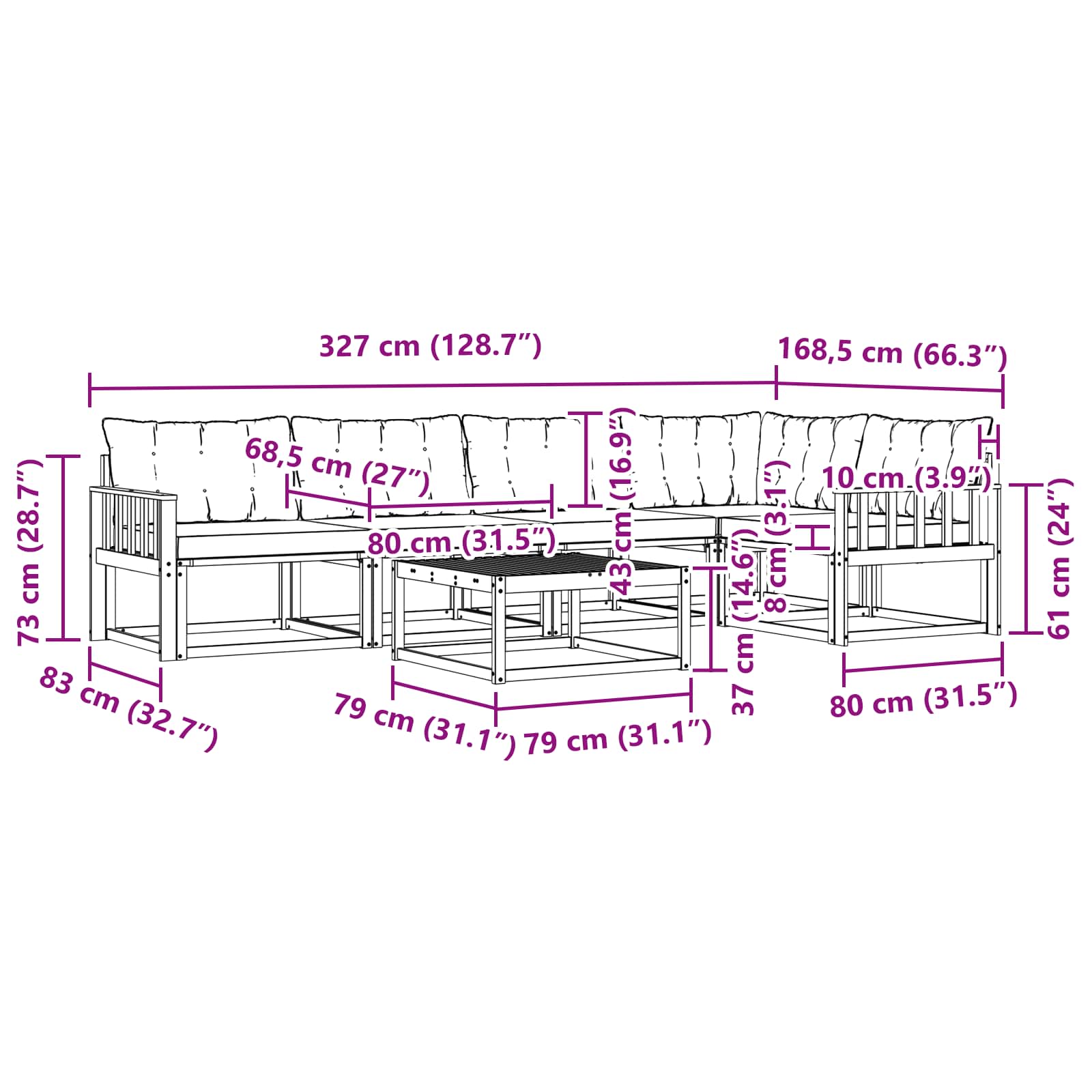 - 4 x Sredinski kavč: 79 x 83 x 73 cm (DxŠxV)