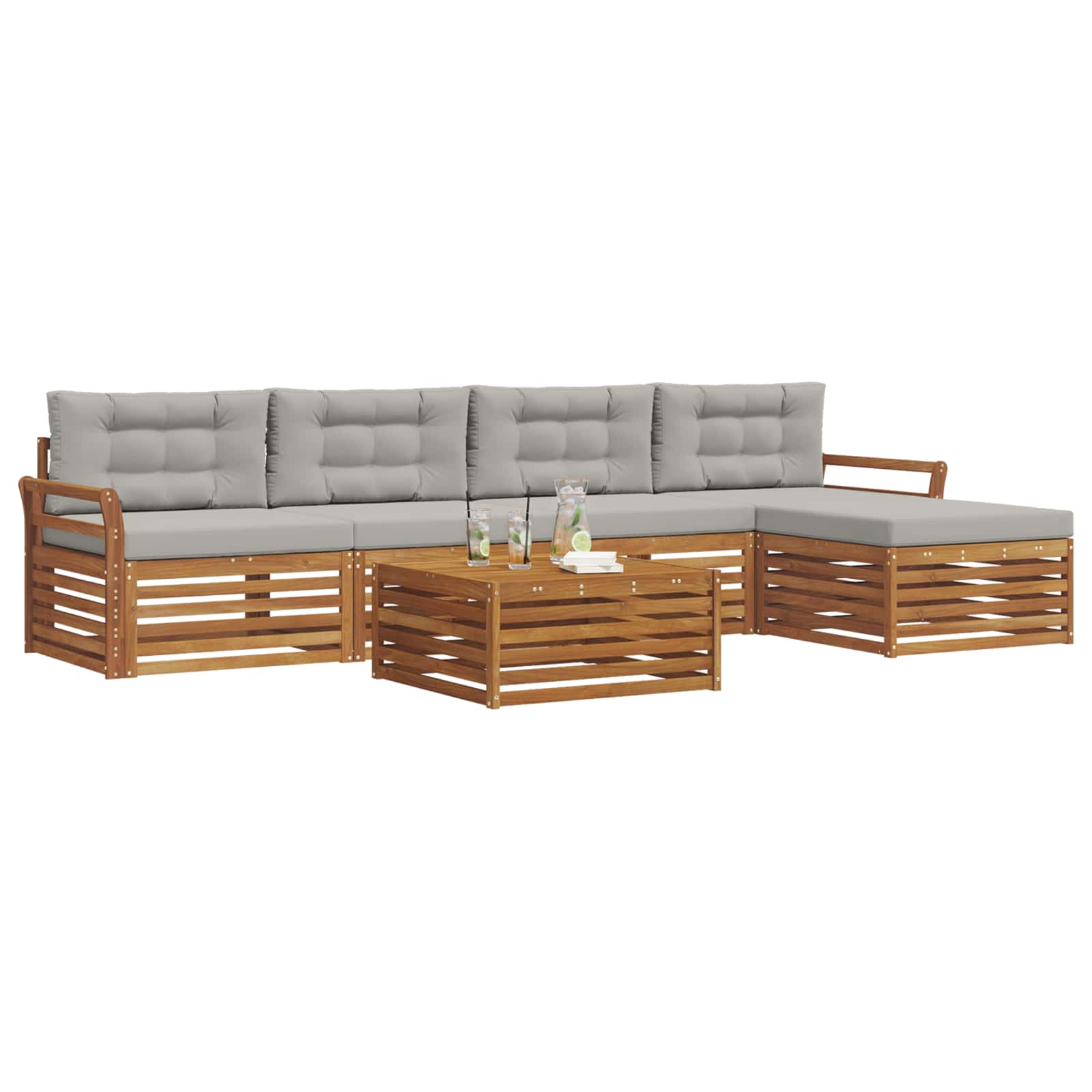 Ta zunanja garnitura povezuje stil in funkcionalnost ter ustvari izjemen center za vaš vrt ali teraso. S sodobnim dizajnom in čistimi linijami dodaja eleganco, obenem pa nudi podporo za sproščanje in druženje. Narejena iz trdnega akacijevega lesa, zagotavlja dolgotrajnost in lep videz – odlična izbira za vse, ki iščejo funkcionalno in estetsko zunanje pohištvo. Vzdržljiv trden akacijev les: Ta zunanji pohištvo iz trdnega akacijevega lesa je zelo vzdržljivo in odporno na vreme. Njegova stabilna konstrukcija zagotavlja dolgo življenjsko dobo, medtem ko topla barva doda čar vsakemu vrtu ali terasi. Oblikovanje odporne na vreme: Ta set zunanji pohištva ima polirano površino, ki dodatno ščiti pred soncem, rahlim dežjem in drugimi zunanjimi elementi. Poliran zaključek pomaga ohranjati videz in delovanje ter zagotavlja dolgo življenjsko dobo za vaš vrt, teraso ali dvorišče. Komponente in oblikovanje: Vsak del garniture, od naslonjal do naslonjal za roke, združuje stil in funkcionalnost. Podporne lastnosti zagotavljajo dodatno udobje, medtem ko koherentno oblikovanje ustvari vizualno privlačen sklop, primeren za vse zunanje priložnosti. Udobje in vsestranskost: Modularna zasnova omogoča prilagodljive postavitve, ki ustrezajo različnim prostorom in potrebam. Ta garnitura je odlična za sprostitev, zabave ali tihe trenutke branja in se enostavno prilagaja vsakemu zunanjemu okolju ter maksimira udobje in uporabnost. Enostavno vzdrževanje: Da pohištvo ostane v dobrem stanju, obrišite površino z vlažno krpo in se izogibajte ostrim ali abrazivnim čistilom. Redno vzdrževanje podaljša življenjsko dobo in ohrani videz pohištva.