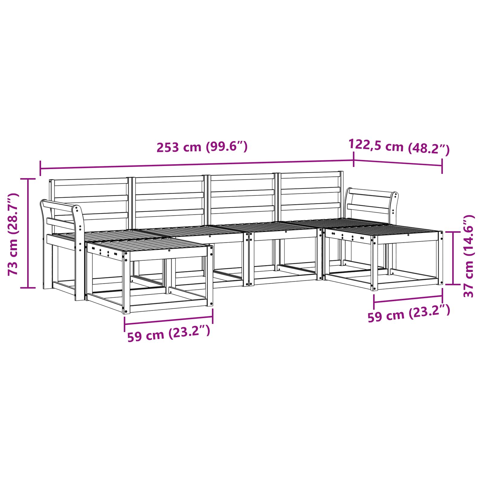 - 4 x Srednji kavč: 59 x 63 x 73 cm (D x Š x V)