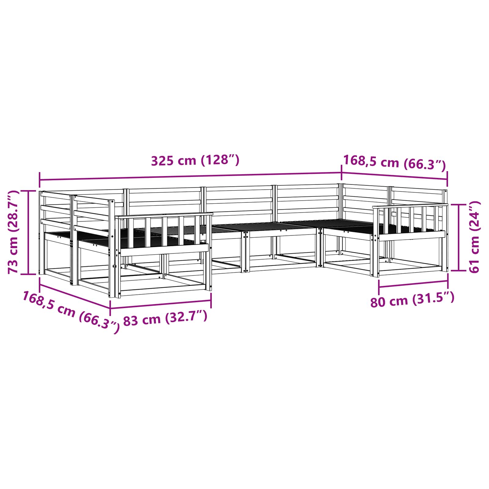 - Splošne dimenzije: 325 x 168,5 x 73 cm (D x Š x V)