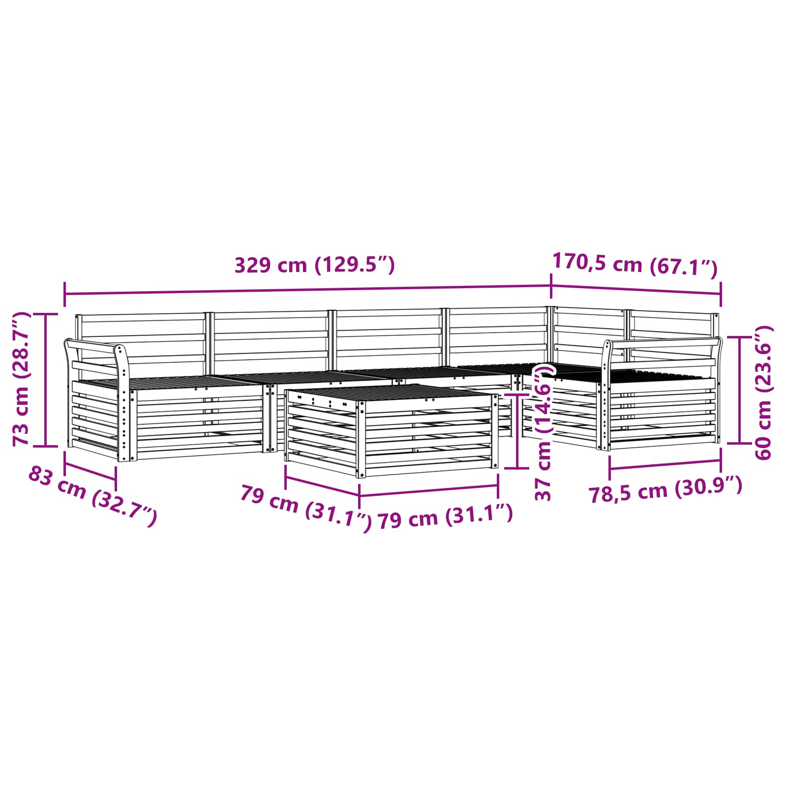 - 4 x Srednji kavč: 79 x 83 x 73 cm (D x Š x V)