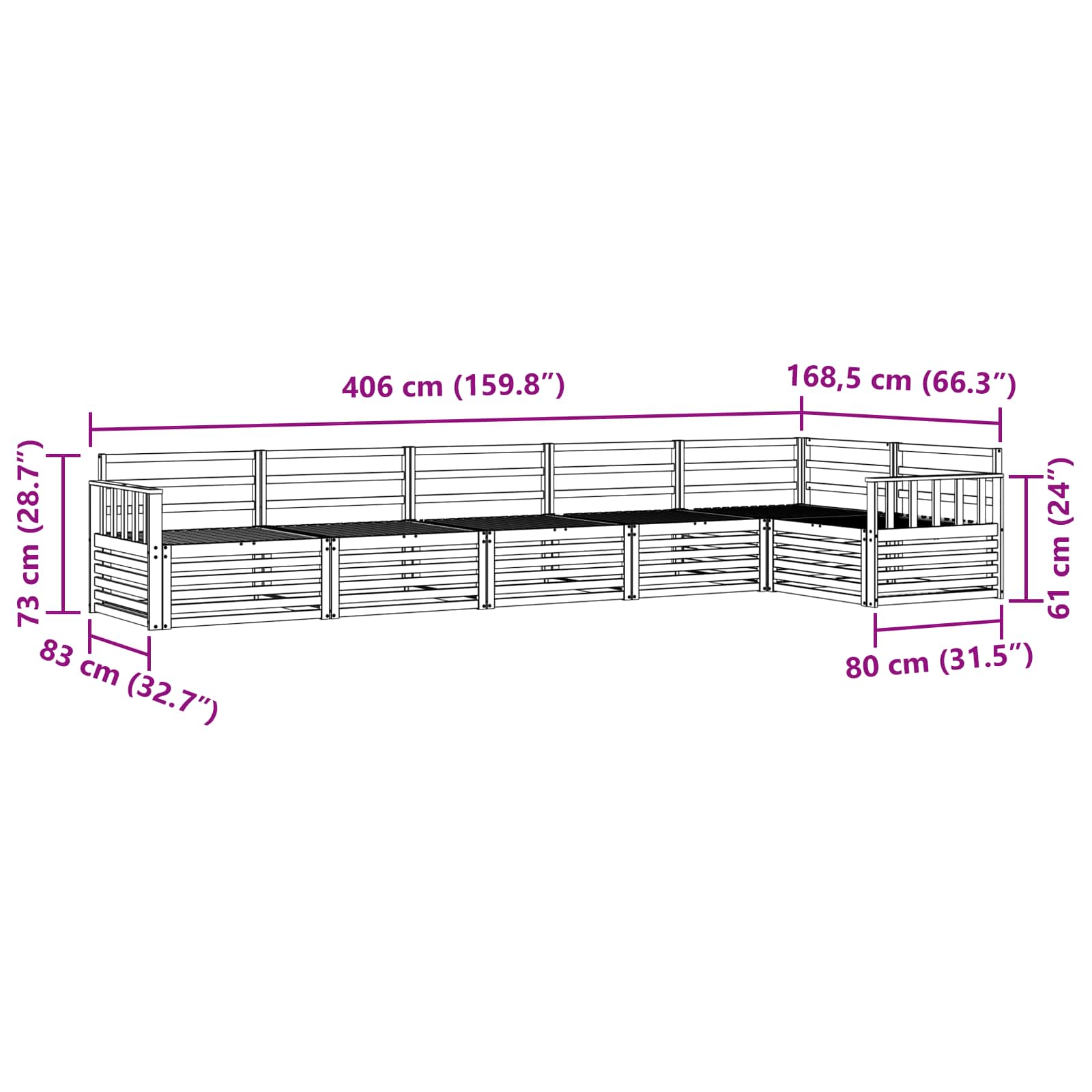 - Splošne dimenzije: 406 x 168,5 x 73 cm (D x Š x V)