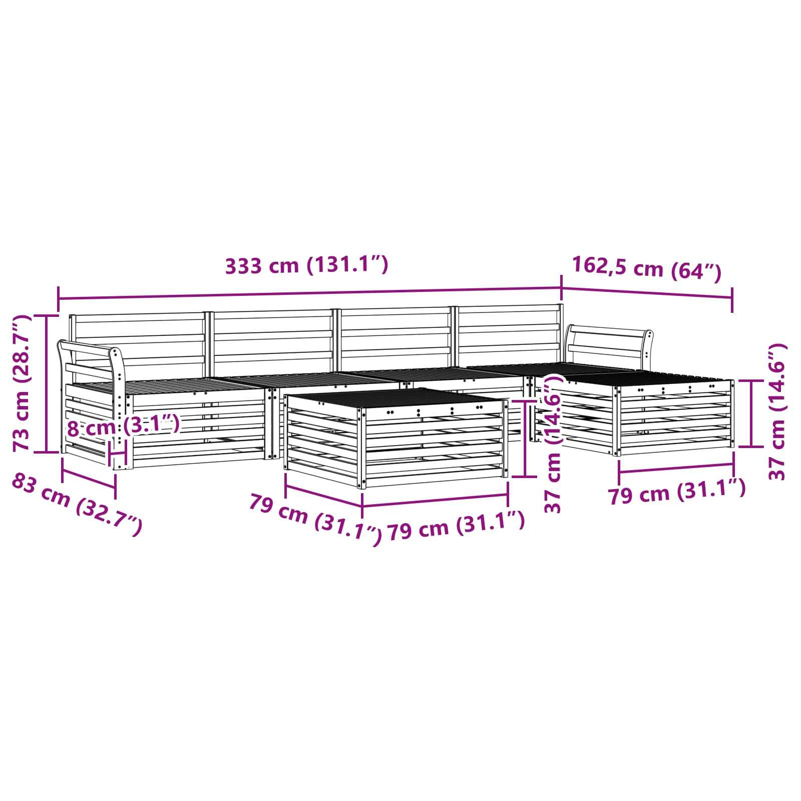 - 4 x Srednji kavč: 79 x 83 x 73 cm (D x Š x V)