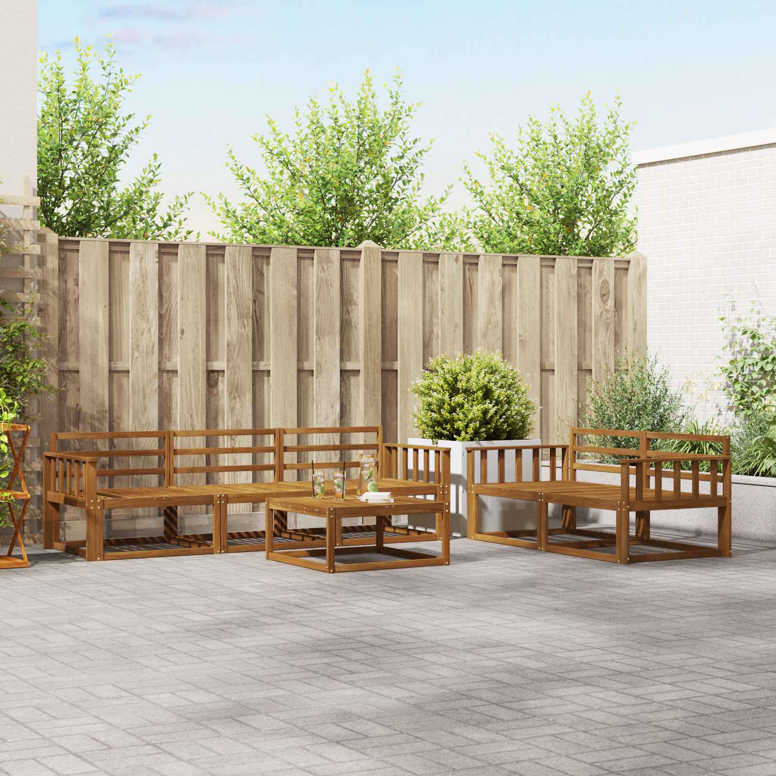Ta eleganten set sofasetov je točno tisto, kar potrebujete za vaš vrt, teraso ali bazen. Moderno zasnovan, združuje stil in funkcionalnost, njegove tople rjave barve in letvasta hrbtišča prinašajo pridih luksuza, ter ustvarjajo udoben prostor za druženje ali sproščanje. Ne glede na to, ali ste pod streho ali na soncu, ta set prinaša brezčasen šarm in prilagodljivost, kar vabi vse, da uživajo v zunanjih trenutkih. Trden akacijev les: Ta sofaset je narejen iz vrhunskega trdega akacijevega lesa, kar zagotavlja naravno lepoto in trpežnost. Akacija je znana po svoji odpornosti na vreme in obrabo, kar podaljšuje življenjsko dobo pohištva. Lesena struktura je enostavna za vzdrževanje in idealna za moderne uporabnike. Letvasta zasnova: Z elegantno letvasto zasnovo, ta sofaset prinaša funkcionalnost in zračnost. Ergonomična podpora za hrbet nudi udobje, estetska zasnova pa izboljšuje zunanje površine, kar ustvarja prijetna mesta za druženje ali sprostitev. Fiksni letvičasti okvir: Z močno, fiksno zasnovo okvirja, ta sofaset zagotavlja stabilnost in zanesljivost. Idealna izbira za zunanje prostore, konstrukcija pa doda estetsko vrednost, ki poudarja tako trpežnost kot šik izgled. Lastnost odporna na vreme: Zasnovan za zunanjo uporabo, ta set je odporen na različne vremenske pogoje. Od sončnega vremena do vetrovnih večerov, materiali in zasnova zaščitijo pohištvo, da ostane udobno skozi vse leto. Modularna konfiguracija: Ta sofaset vam omogoča, da prilagodite svoje sedežne postavitve, kar je super za različne priložnosti. Ustvarite intime skupine ali širša ležišča, kar se enostavno prilagaja vašim potrebam. Njegova vsestranskost povečuje uporabnost in omogoča prilagoditev prostora po želji.