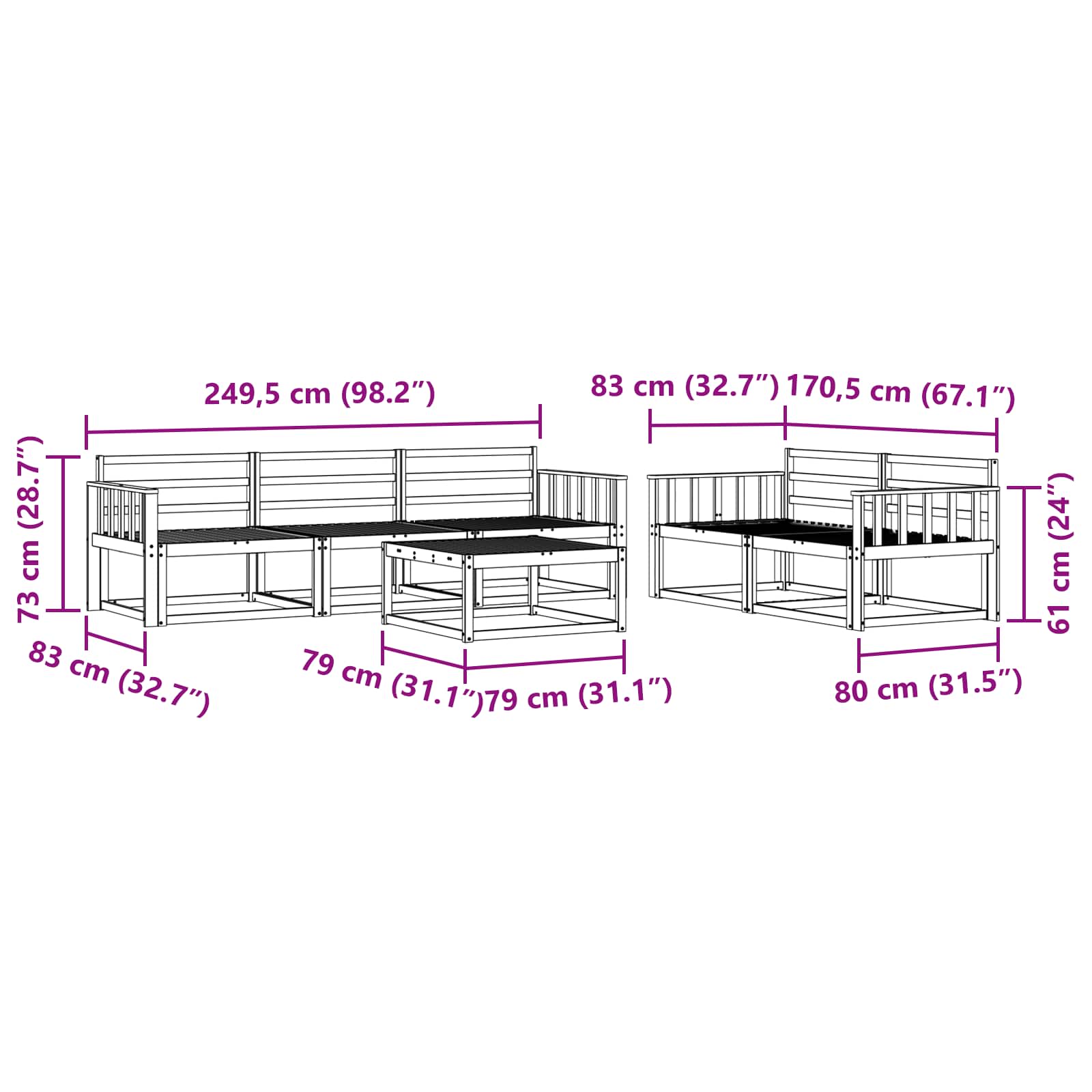 - 5 x srednji kavč: 79 x 83 x 73 cm (D x Š x V)
