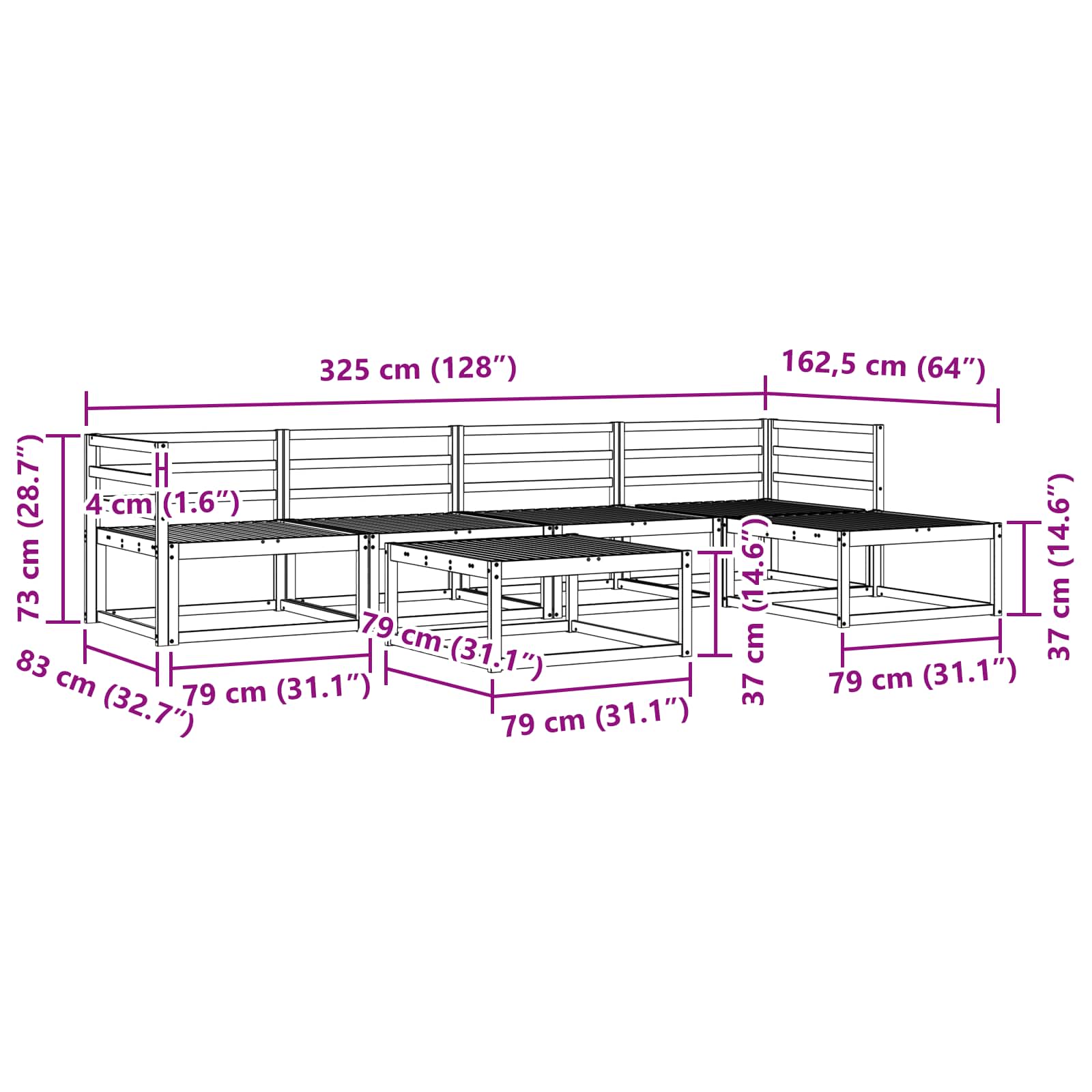 - 4 x Srednji kavč: 79 x 83 x 73 cm (D x Š x V)
