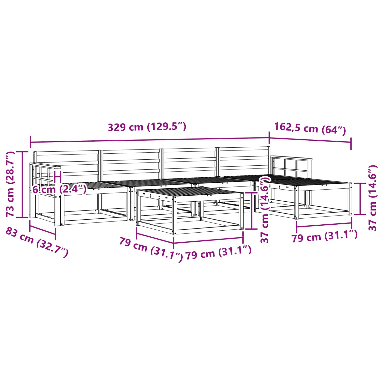 - 4 x Srednji kavč: 79 x 83 x 73 cm (D x Š x V)