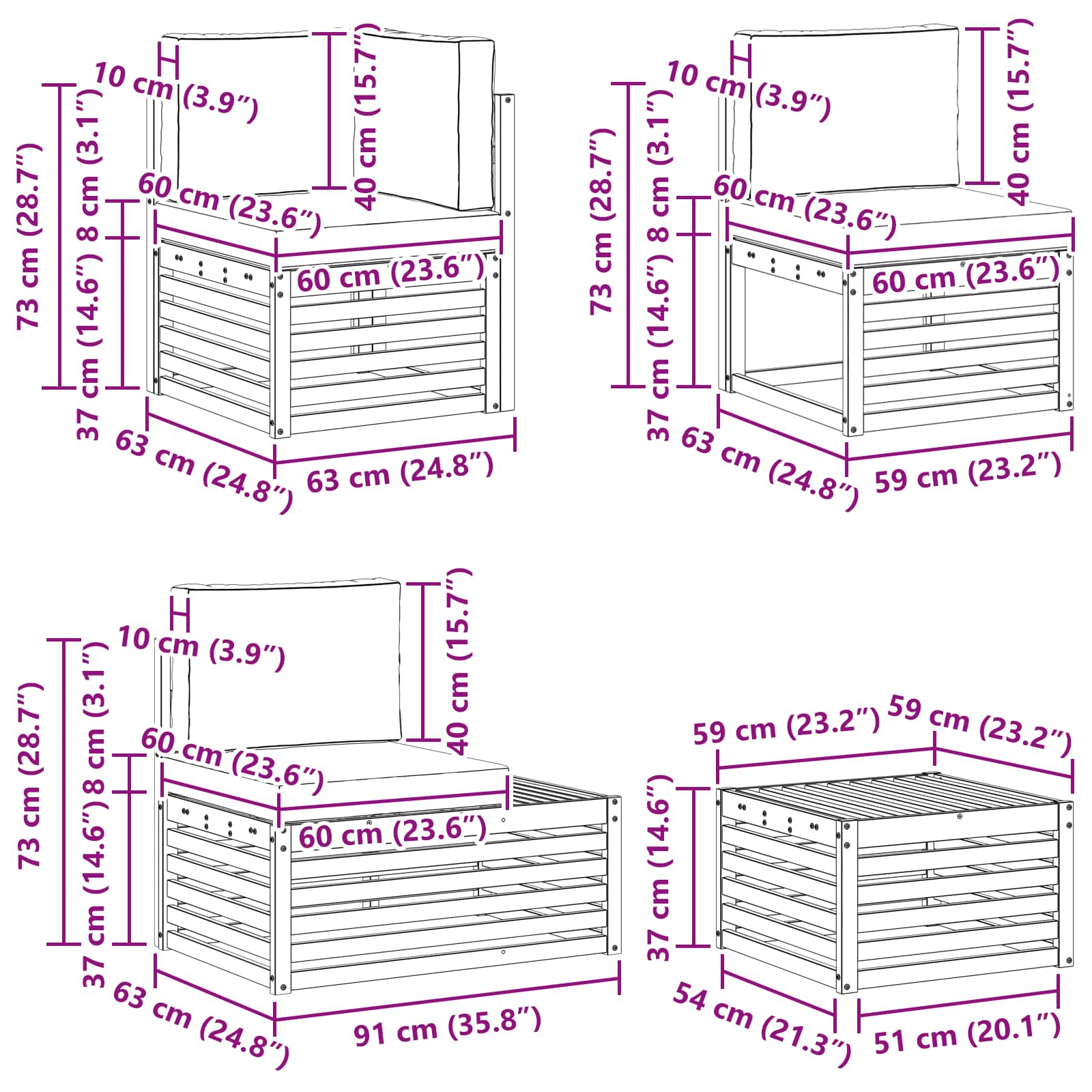 - 6 x sedežna blazina: 60 x 60 x 8 cm (D׊×V)
