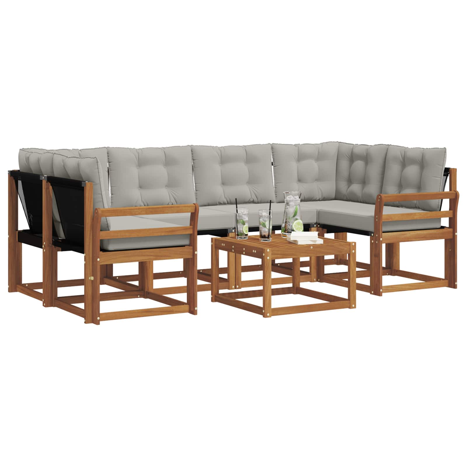 Ta moderni sedežni set je središče vsake zunanje prostorije, s stilom, ki popestri vaš vrt, teraso ali bazen. Uživajte na prostem: naravna tekstura lesa in podpora hrbtu ter udobni nasloni za roke vam omogočajo prijetno sprostitev in hkrati dvigujejo vaš zunanji dekor. Njegovi zemeljski odtenki se popolnoma ujamejo v naravno okolico in nudijo prijetno vzdušje za druženje ali sprostitev. Eleganten material: Izdelan iz akacijevega lesa in Textilene, ta sedežni set ponuja naravno teksturo in trpežne sedežne površine. Združene komponente nudijo moderne linije in dolgotrajno vzdržljivost v vseh vremenskih pogojih. Celovita zasnova: Opremljen z udobnimi blazinami in podporo za hrbet, je vsak del seta zasnovan za udobje. Praktični nasloni za roke in odprti vrh omogočajo lažje čiščenje, kar povečuje udobje med sproščanjem na prostem. Pameten dizajn: Odporen na bledenje, ta set zagotavlja dolgotrajno zanimanje in enostavno vzdrževanje, saj so površine enostavne za čiščenje, kar zagotavlja svež izgled za vsakodnevno uporabo. Vsestrana uporaba: Idealno za vrt, teraso ali bazen, ta sedežni set se prilagaja različnim zunanjim prostorom. Njegov moderen slog dodaja pridih sofisticiranosti, kar je primerno za zabave ali prijetno sprostitev. Enostavno vzdrževanje: Ta sedežni set je zasnovan za hitro in enostavno čiščenje – le obrišite ga z vlažno krpo. Snemljive prevleke olajšajo nego in zagotavljajo dolgotrajno privlačnost.