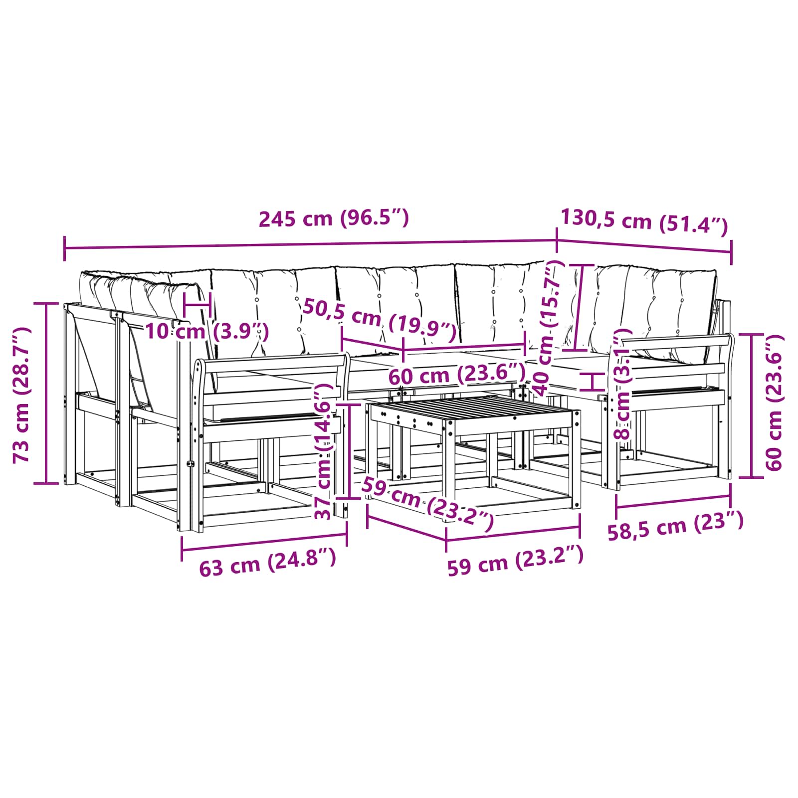 - 8 x Nazadnja blazina: 60 x 40 x 10 cm (DxŠxV)