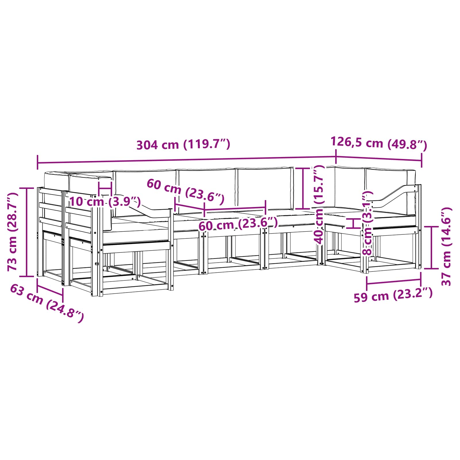 - 7 x sedežna blazina: 60 x 60 x 8 cm (D x Š x V)
