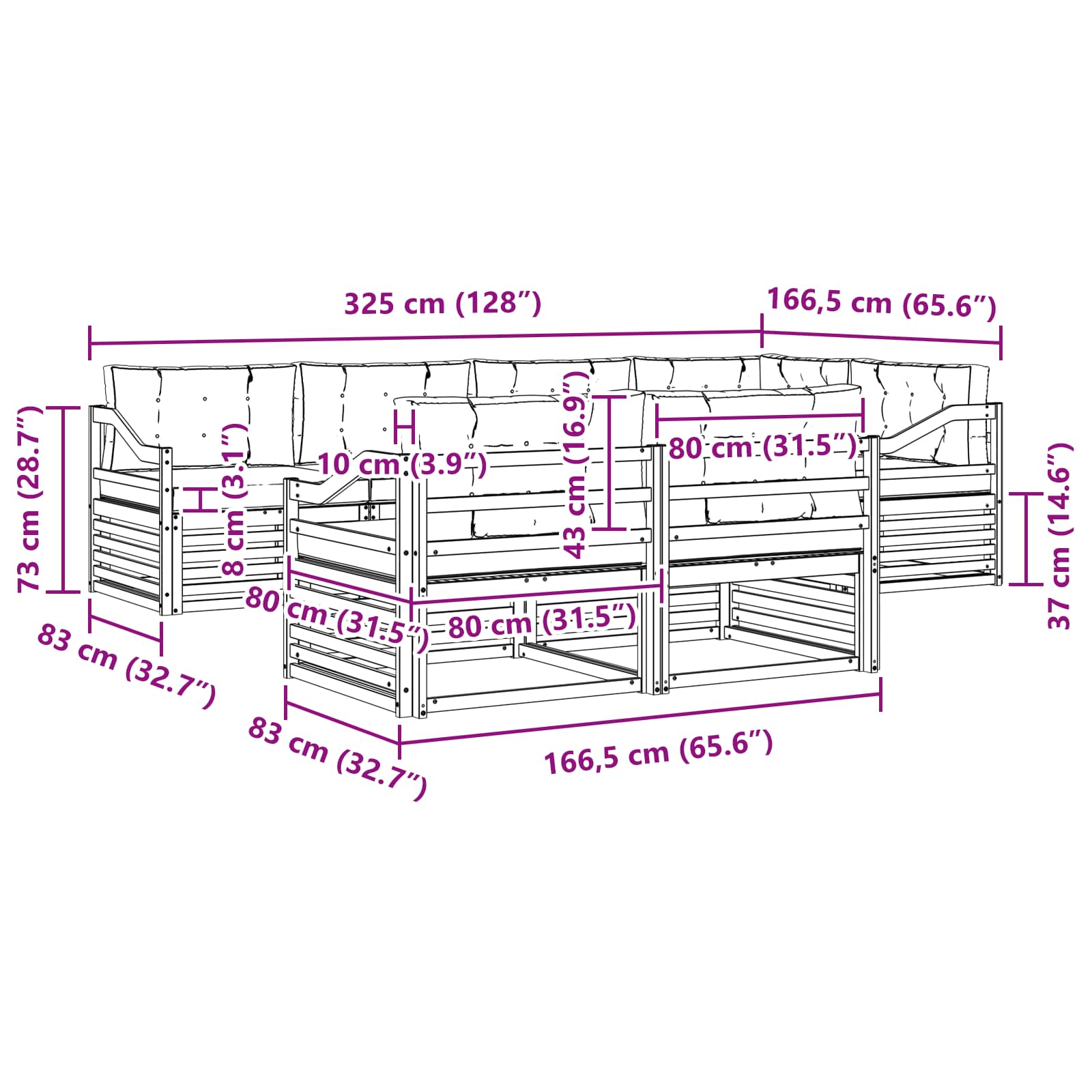 - 8 x hrbtna blazina: 80 x 43 x 10 cm (D x Š x V)