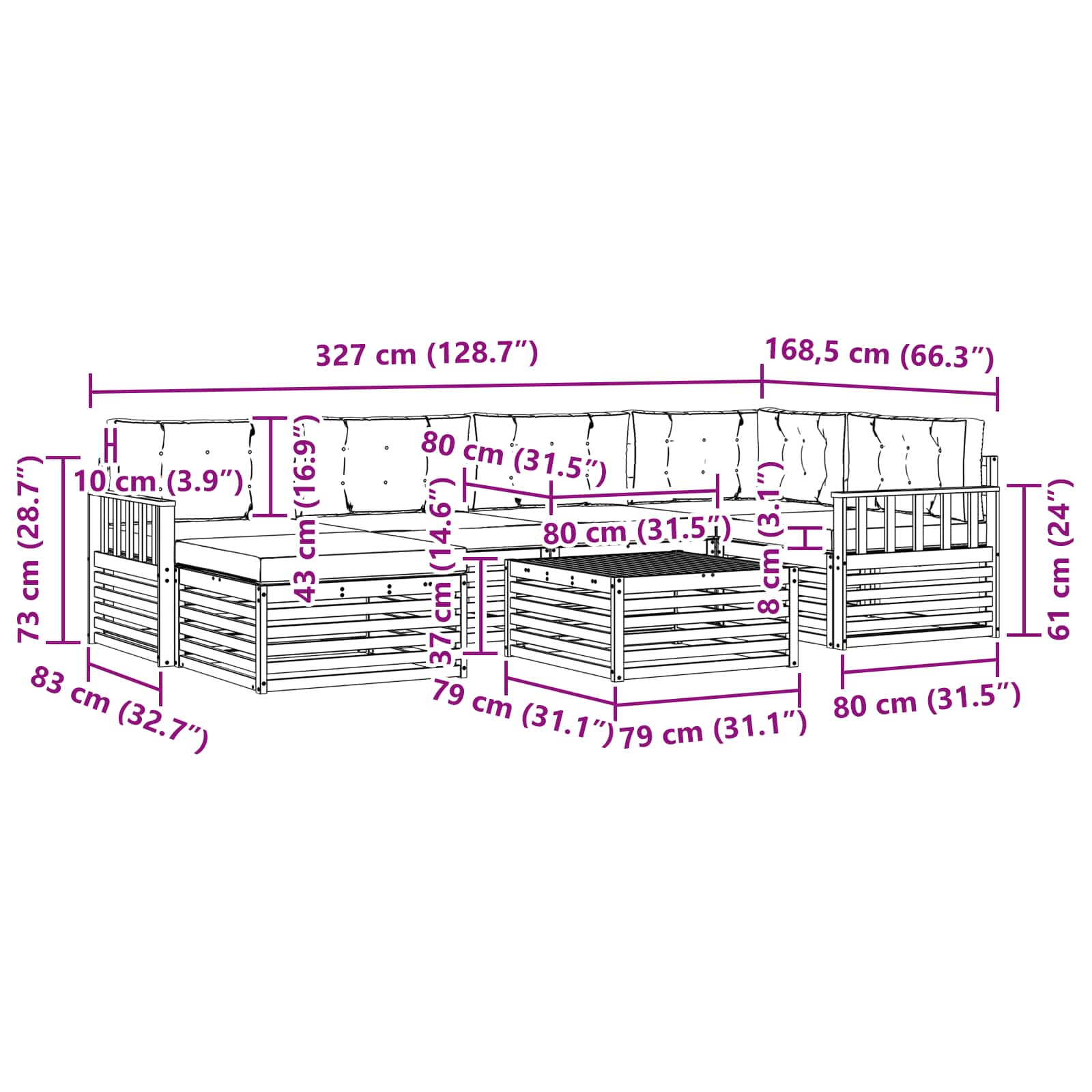 - 6 x Sedežna blazina: 80 x 80 x 8 cm (ŠxGxV)