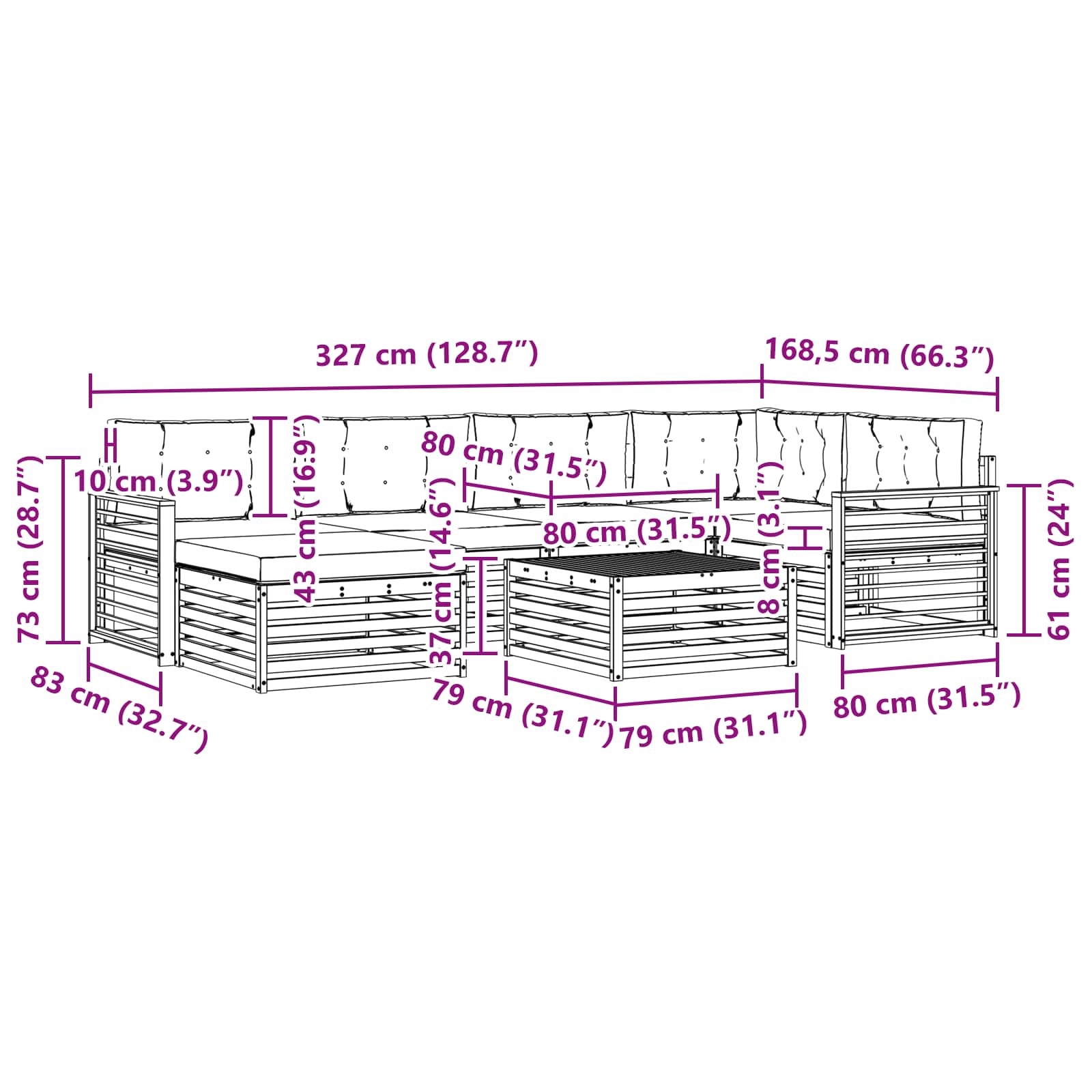 - 6 x Sedežna blazina: 80 x 80 x 8 cm (ŠxGxV)