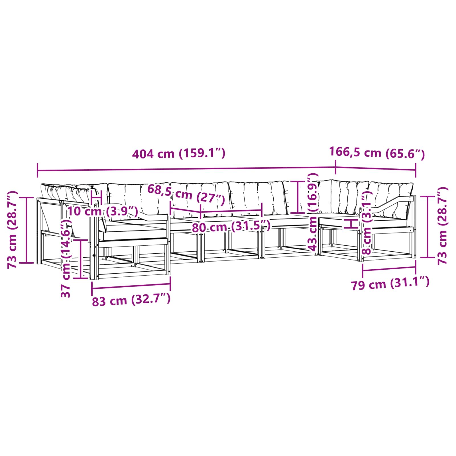 - 9 x hrbtna blazina: 80 x 43 x 10 cm (D x Š x V)