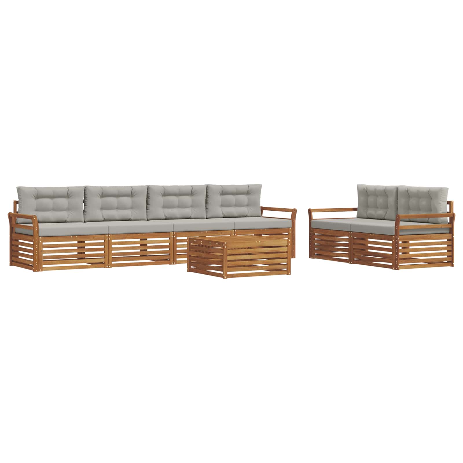 Set zunanjega pohištva združuje stil in funkcionalnost ter je osrednji kos za vsak vrt ali teraso. Modern dizajn z jasnimi linijami in minimalnimi podrobnostmi doda eleganco, hkrati pa podpira udobje in družabna srečanja na prostem. Zasnovan je iz trdega akacijevega lesa, kar zagotavlja dolgo življenjsko dobo in privlačen videz, zato je prava izbira za vse, ki iščejo praktičnost in eleganco v zunanjem pohištvu. Vzdržljiv trden akacijev les: Ta set zunanjega pohištva je narejen iz akacijevega lesa, znanega po svoji trdnosti in odpornosti na vremenske vplive. Močna konstrukcija zagotavlja trdno podporo in dolgo stabilnost, njena naravna barva pa obogati vsak vrt ali teraso. Oblikovanje, odporno na vreme: Set ima lakirano površino, ki nudi zaščito pred soncem in lahkim dežjem. Poliran zaključek ohranja videz in funkcionalnost ter zagotavlja dolgo življenjsko dobo za tvojo teraso ali dvorišče. Komponente in oblikovanje: Vsaka komponenta, od naslonjal do hrbtišč, je zasnovana tako, da je funkcionalna in stilna. Dodatne podporne lastnosti zagotavljajo udobje, medtem ko usklajena zasnova prinaša vizualno harmonijo, primerno za različne zunanje prostore. Udobje in prilagodljivost: Modularna zasnova omogoča prilagodljive postavitve, kar ustreza različnim potrebam. Super je za sproščanje, družabna srečanja ali tihe trenutke z bralno knjigo, ta set se hitro prilagaja vsem zunanjim okoljem, kar povečuje udobje in uporabnost. Enostavno vzdrževanje: Da ohraniš pohištvo v dobrem stanju, ga obriši z vlažno krpo in se izogibaj močnim čistilom. Redno vzdrževanje ohranja videz in podaljšuje življenjsko dobo pohištva.