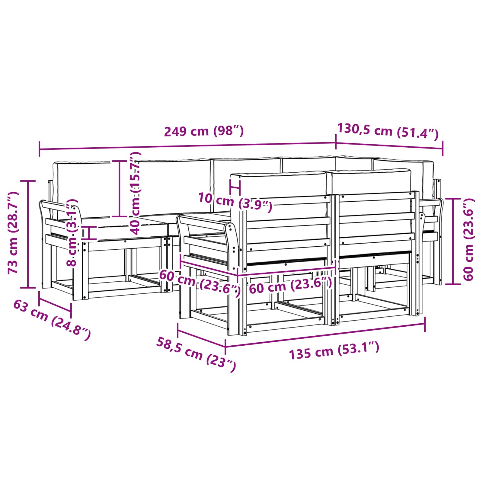 - 7 x sedežna blazina: 60 x 60 x 8 cm (D x Š x V)