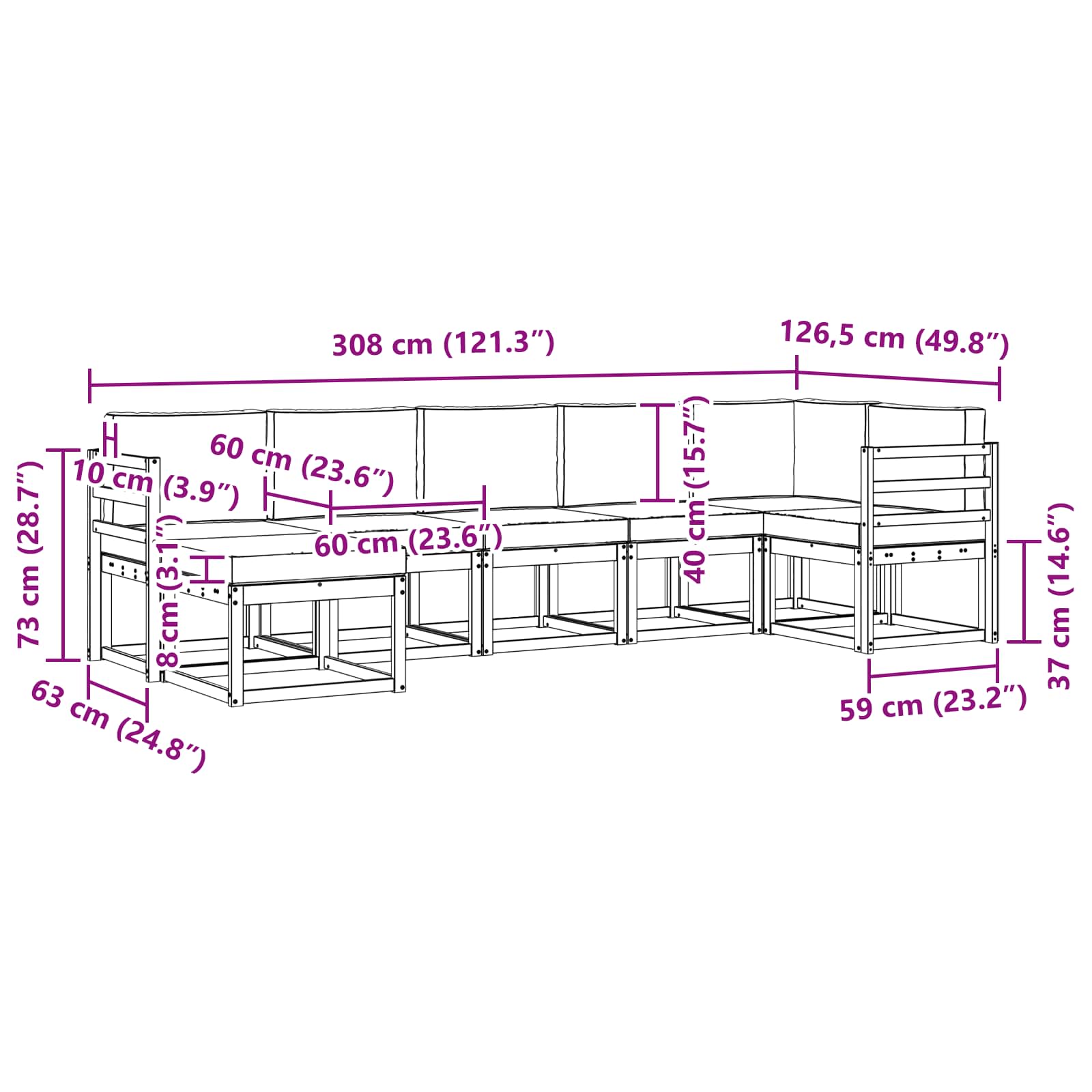 - 7 x sedežni blazina: 60 x 60 x 8 cm (D x Š x V)