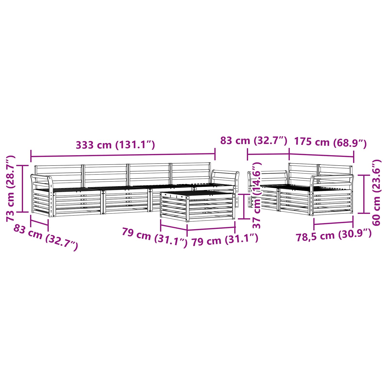 - 6 x Srednji kavč: 79 x 83 x 73 cm (DxŠxV)
