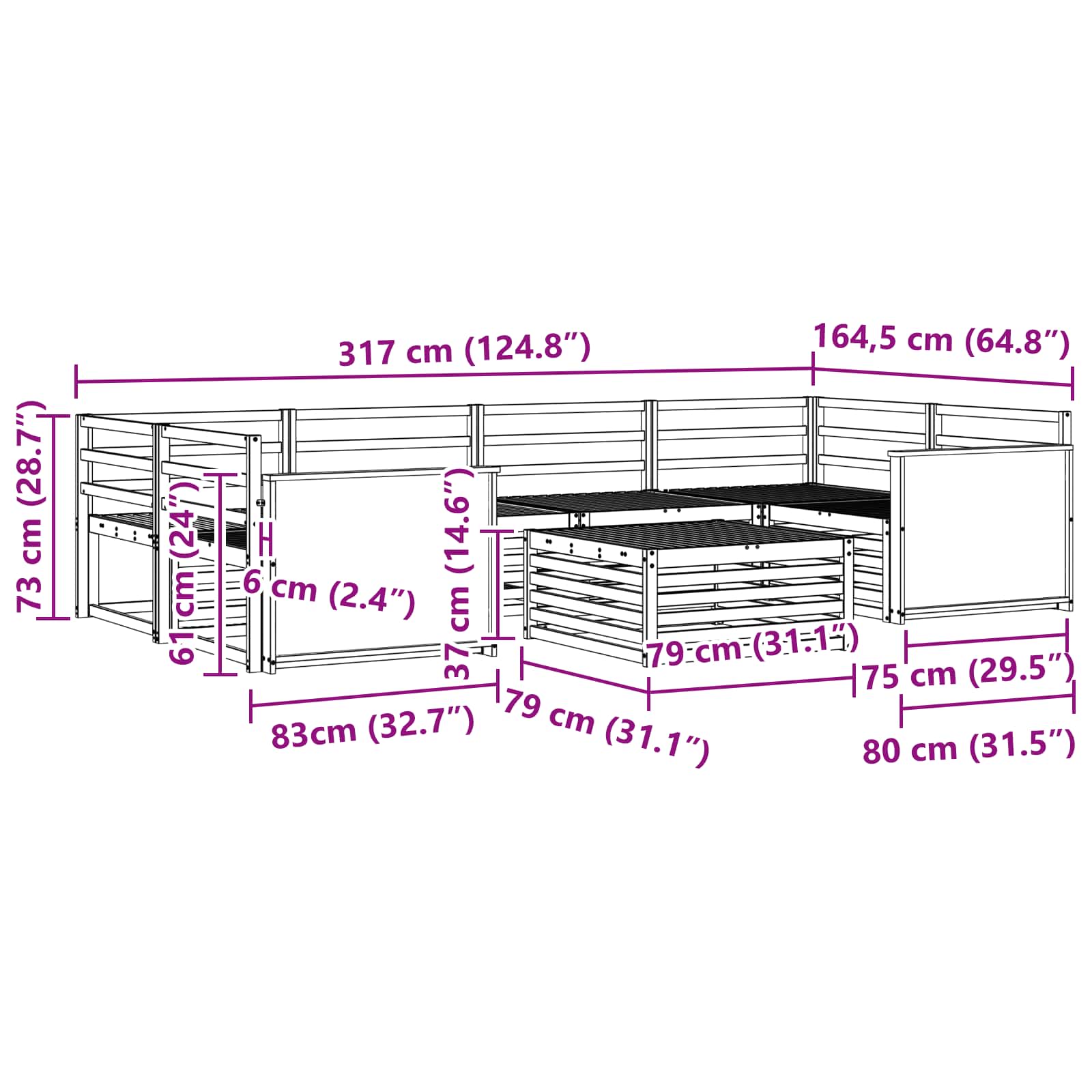 - 4 x Srednji kavč: 79 x 83 x 73 cm (D x Š x V)