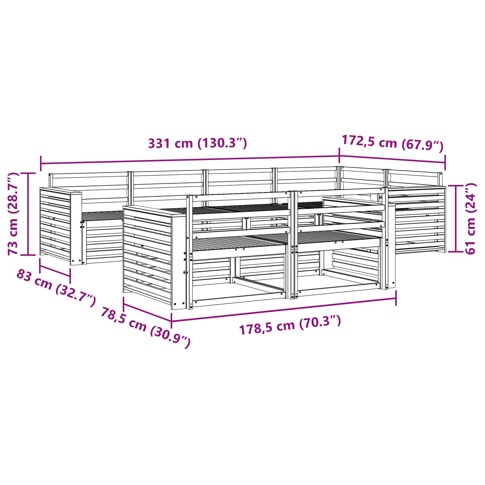 - Splošne dimenzije: 331 x 172,5 x 73 cm (D x Š x V)