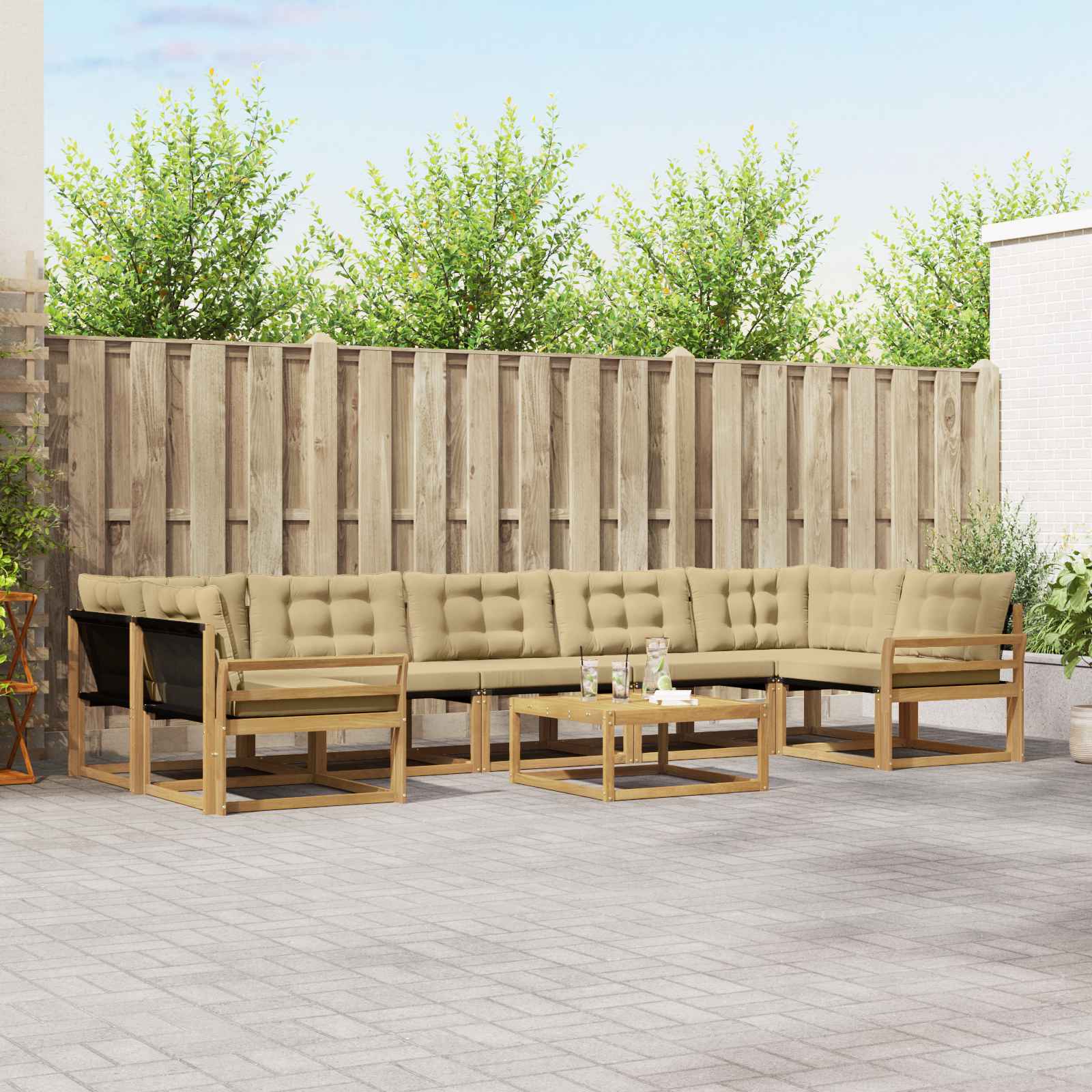 Ta sedežni set, narejen za zunanjo uporabo, združuje stil in funkcionalnost. Ima moderni videz z čistimi linijami in minimalno okrasitvijo, kar je idealno za vrtnarske ali terasne postavitve. Bogat rjav ton skupaj s privlačno lesno teksturo doda pridih elegance in vabi k sprostitvi in pogovoru. Ne glede na to, ali prirejaš poletno večerjo ali le uživaš pod zvezdami, se ta set brez težav prilagodi trenutku in ti omogoča, da ga konfiguriraš po svojih željah. Materiali in zaključek Narejen iz trdnega akacijevega lesa in Textilene, ta sedežni set združuje lepoto in uporabnost. Naravna odpornost akacijevega lesa ščiti pred vremenskimi vplivi, kar ga naredi primernega za zunanjo uporabo. V kombinaciji s tkanino Textilene, ki je znana po svoji vzdržljivosti in odpornosti proti bledenju, ta set obljublja, da bo dolgo ohranil svoj privlačen videz. Vključene komponente Set vsebuje različne kose, ki so prilagojeni udobju in uporabnosti. Vsak kos ima dobro oporo za hrbet in udobne naslone za roke, kar povečuje udobje med druženjem. Modularna zasnova omogoča enostavno preoblikovanje prostora, kar ga dela prilagodljivega za vsako priložnost. Lastnosti in funkcionalnost Ta set je zasnovan tako, da je odporen proti bledenju in enostaven za čiščenje, kar pomeni malo vzdrževanja. Zadrga na odstranljivih blazinah dodaja še eno plast udobja in omogoča preprosto vzdrževanje. Takšne funkcije zagotavljajo mešanico razkošja in praktičnosti, kar spodbuja daljšo uporabo. Priporočene uporabe Idealno za vrtove in terase, ta set je super izbira za zunanje prostore. Njegov moderen dizajn se lepo ujema z vsakim sodobnim okoljem, medtem ko robustni materiali zdržijo vremenske vplive, kar ga dela primernega tako za stanovanjske kot komercialne nastavitve. Vzdrževanje in oskrba Ohranjanje tega seta je enostavno: le obrišite površino z vlažno krpo, da ostane brezhiben. V slabem vremenu ga lahko pokrijete, da ohranite njegovo stanje skozi vse leto. Ti preprosti postopki oskrbe zagotavljajo, da vsak kos ohranja svoj čar in delovanje, kar se brez težav vključuje v vaš način življenja na prostem.