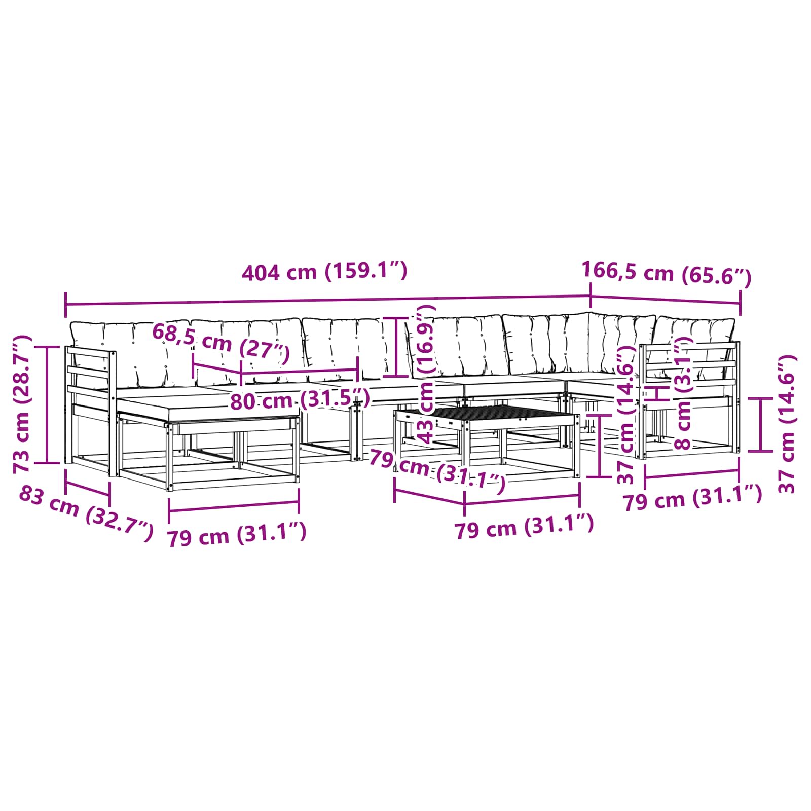 - 5 x Sedežna blazina: 80 x 68,5 x 8 cm (D x Š x V)
