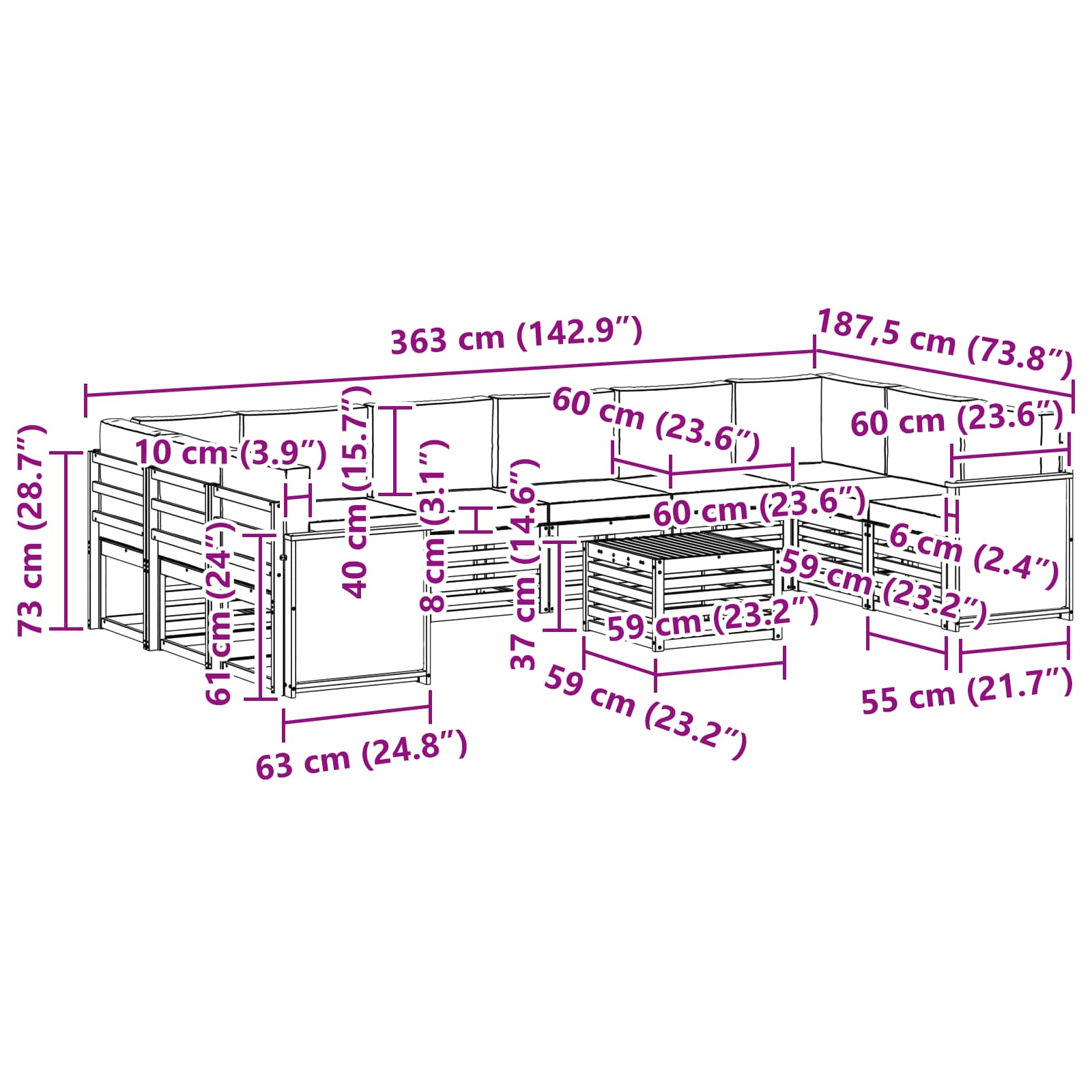 - 10 x Sedežna blazina: 60 x 60 x 8 cm (D x Š x V)