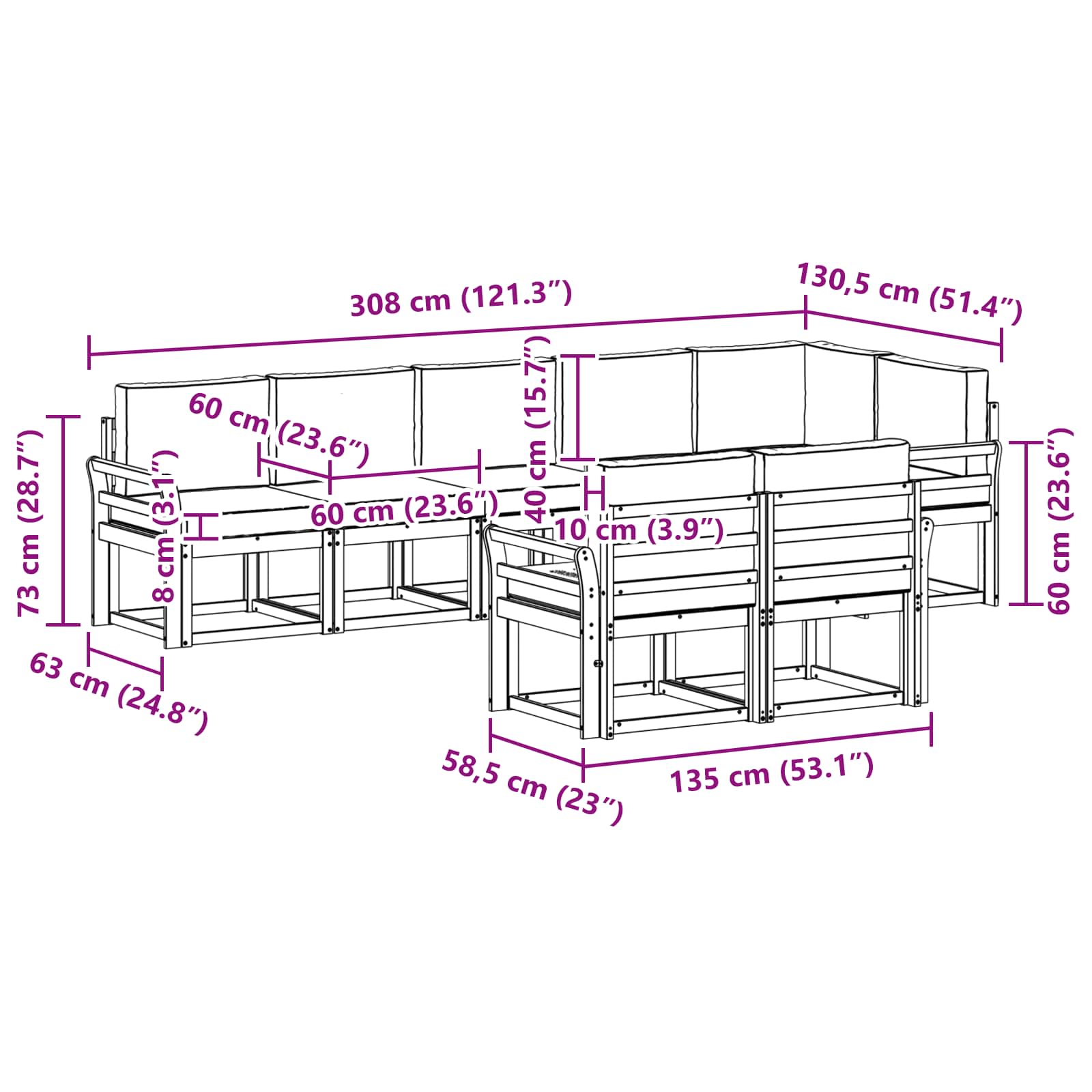 - 8 x sedežni blazina: 60 x 60 x 8 cm (D x Š x V)