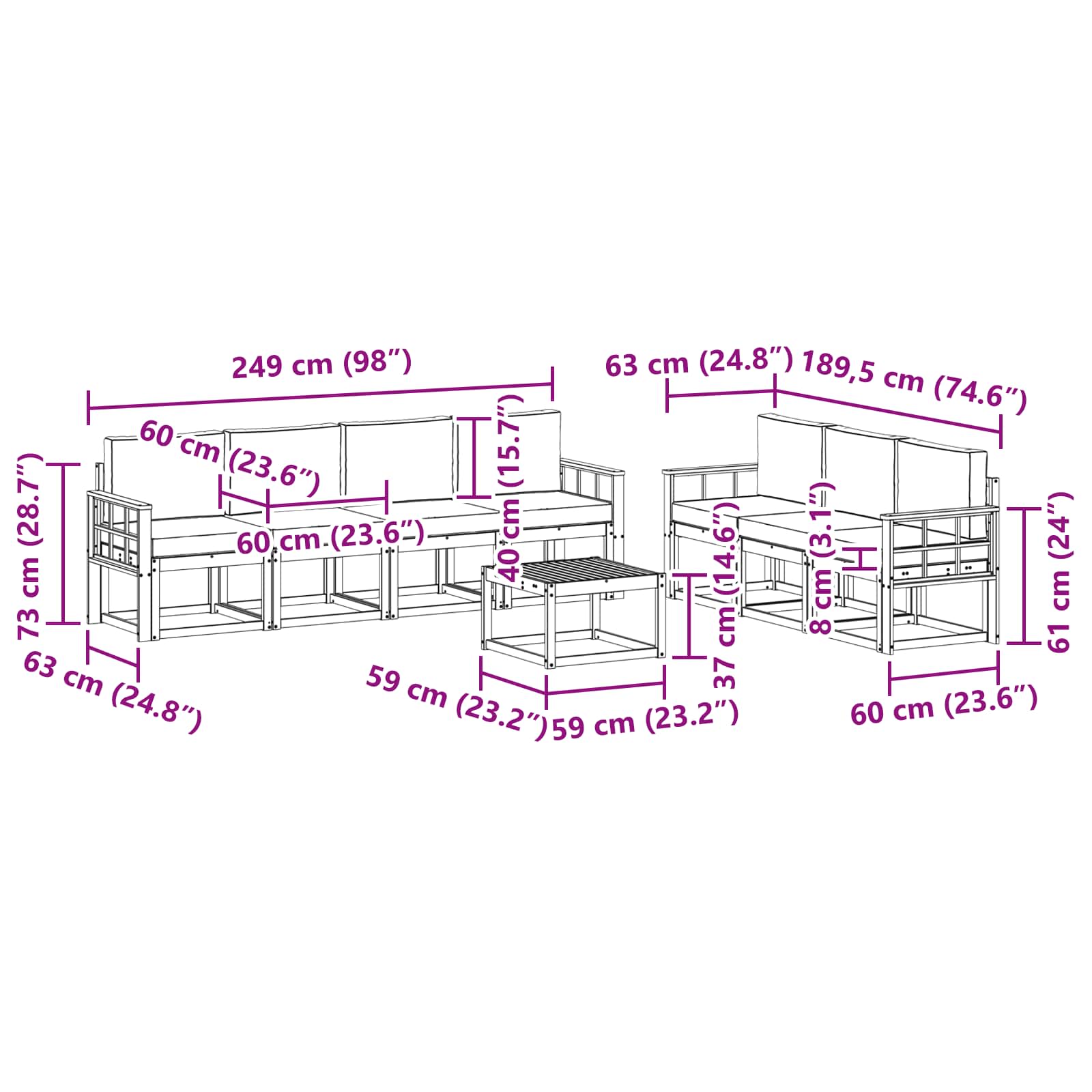 - 7 x sedežna blazina: 60 x 60 x 8 cm (D x Š x V)