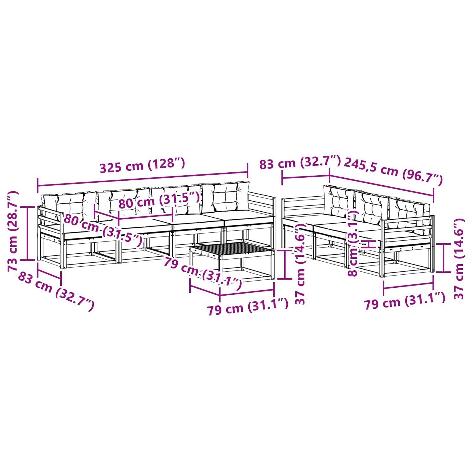 - 7 x srednji kavč: 79 x 83 x 73 cm (D x Š x V)