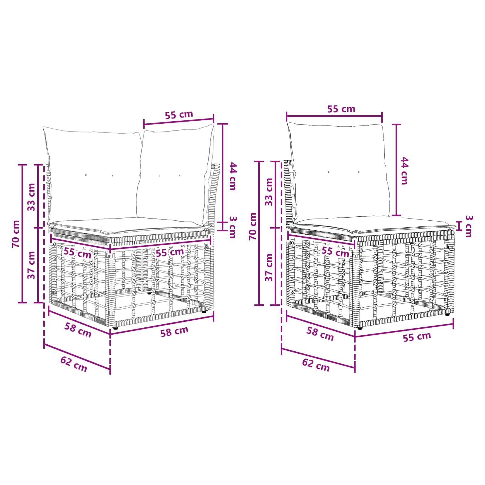 - 4 x srednji kavč: 55 x 62 x 70 cm (D x Š x V)