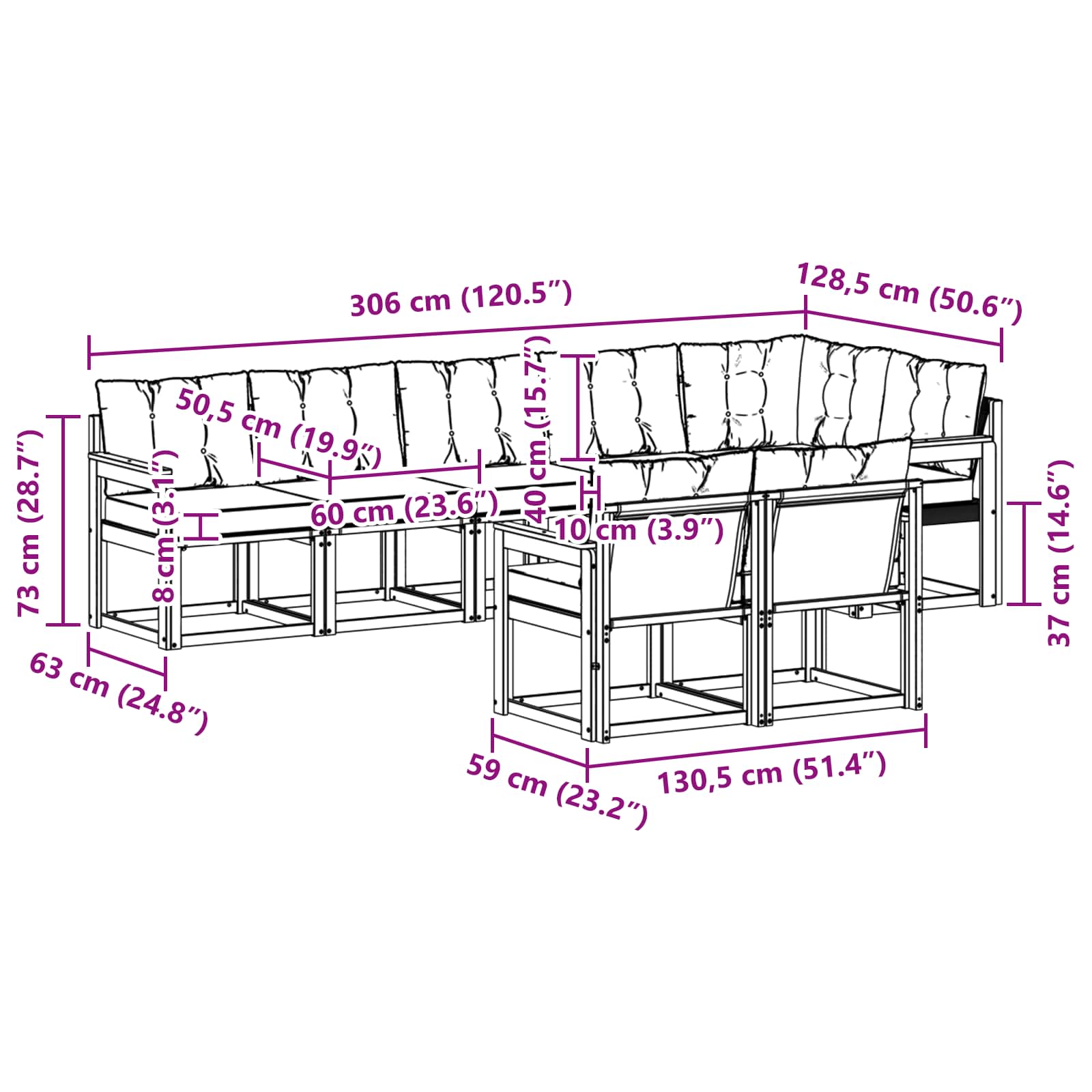 - 7 x sedežna blazina: 60 x 50,5 x 8 cm (D x Š x V)