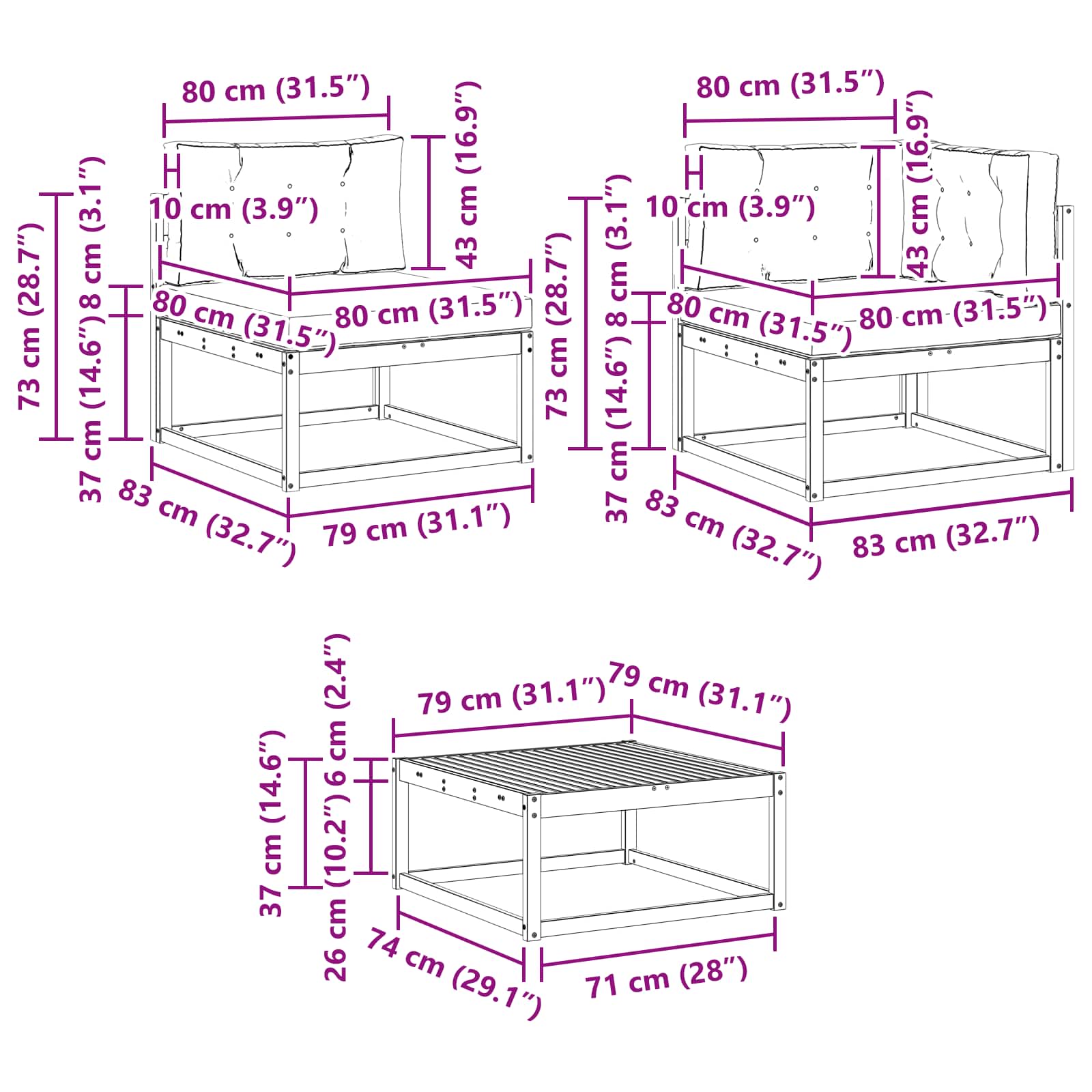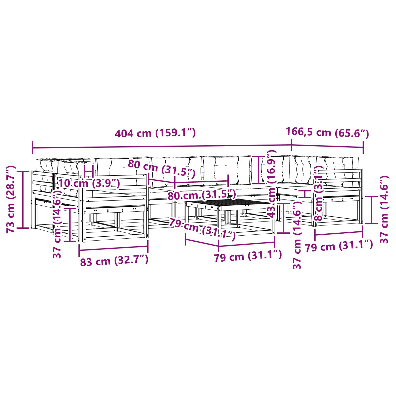 - 7 x sedežna blazina: 80 x 80 x 8 cm (D x Š x V)
