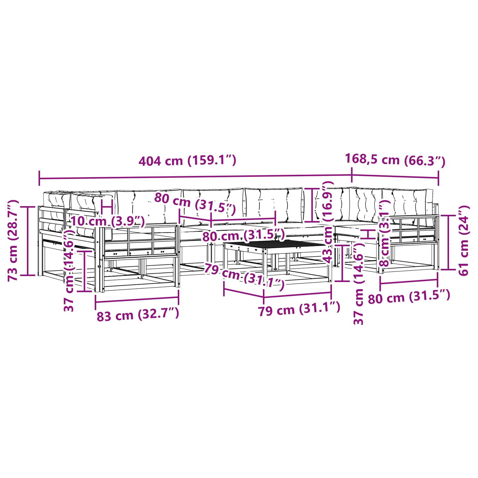 - 7 x sedežna blazina: 80 x 80 x 8 cm (D x Š x V)
