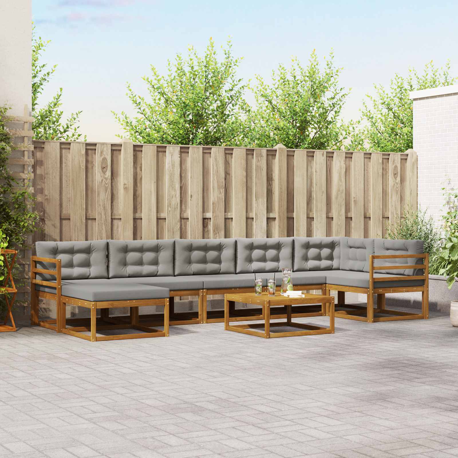Ta zunanja sekcijska sedežna garnitura brez težav združuje sodoben dizajn in funkcionalnost, kar ji daje idealno vlogo za sedenje na vrtu, terasi, dvorišču ali ob bazenu. Je super za druženje na prostem, čiste linije in minimalistična estetika pa se prilegata različnim okoljem ter nudita udobje in sprostitev. Trdni akacijevi materiali: Ta sedežna garnitura, skrbno narejena iz akacijevega lesa, ponuja dolgoživost in privlačen videz, ki omogoča udobno izkušnjo sedenja. Vključeni elementi: Zasnova z rešetkastim hrbtom in trdimi akacijevimi nasloni za roke združuje stil in funkcionalnost, kar prispeva k udobni uporabi. Namenski elementi: Rešetkasta zasnova omogoča boljši pretok zraka in zagotavlja udobje ter sprostitev med uporabo. Raznolikost uporabe: Ta sedežna garnitura je idealna za vrtove, terase in dvorišča ter je zelo vsestranska, saj ji prilagodite razporeditve sedežev. Enostavno vzdrževanje: Ohranite videz garniture z občasnim brisanjem z vlažno krpo in jo zaščitite pred soncem ter uporabljajte pokrivalo, ko je ne uporabljate, da podaljšate njeno življenjsko dobo.