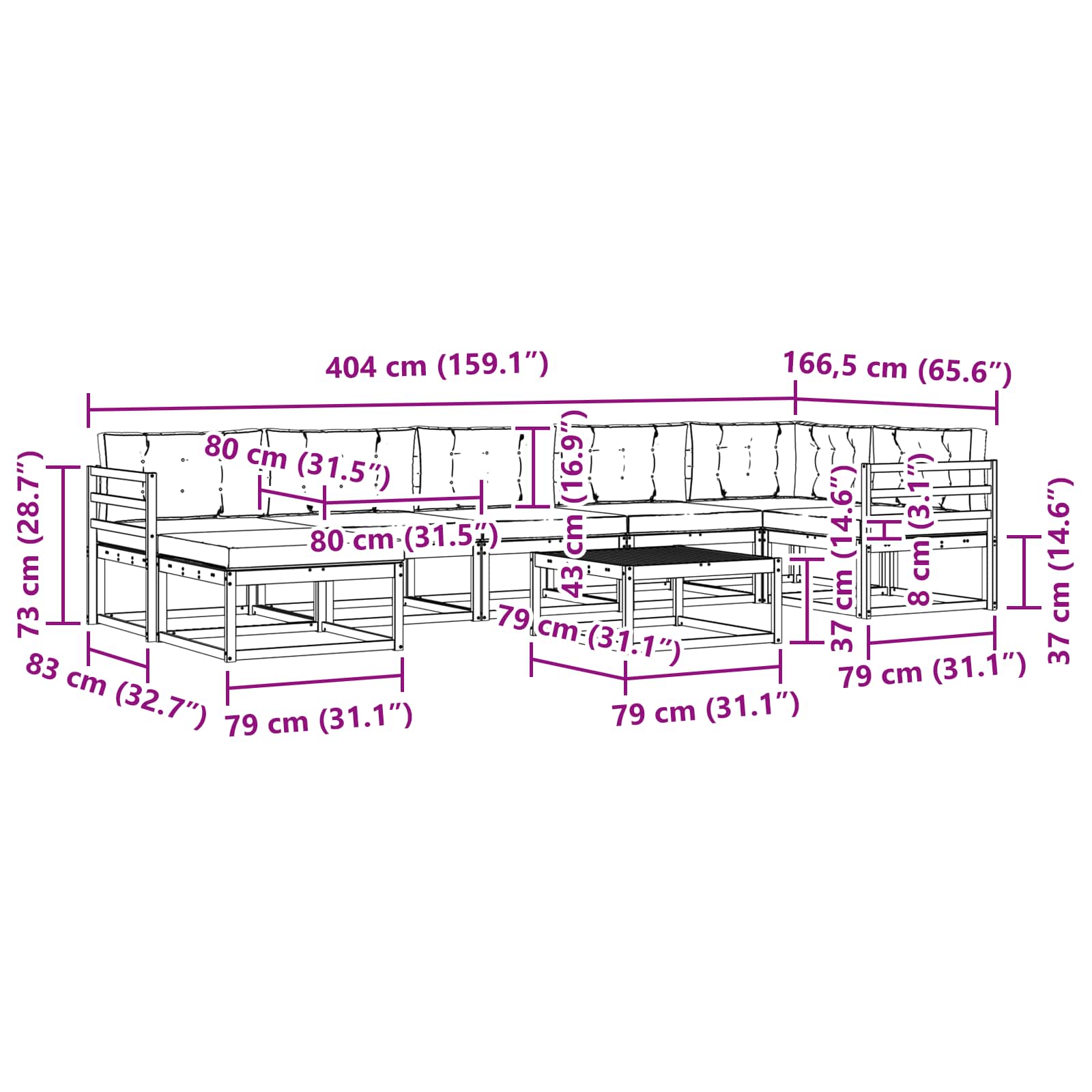 - 7 x Sedežna blazina: 80 x 80 x 8 cm (D x Š x V)