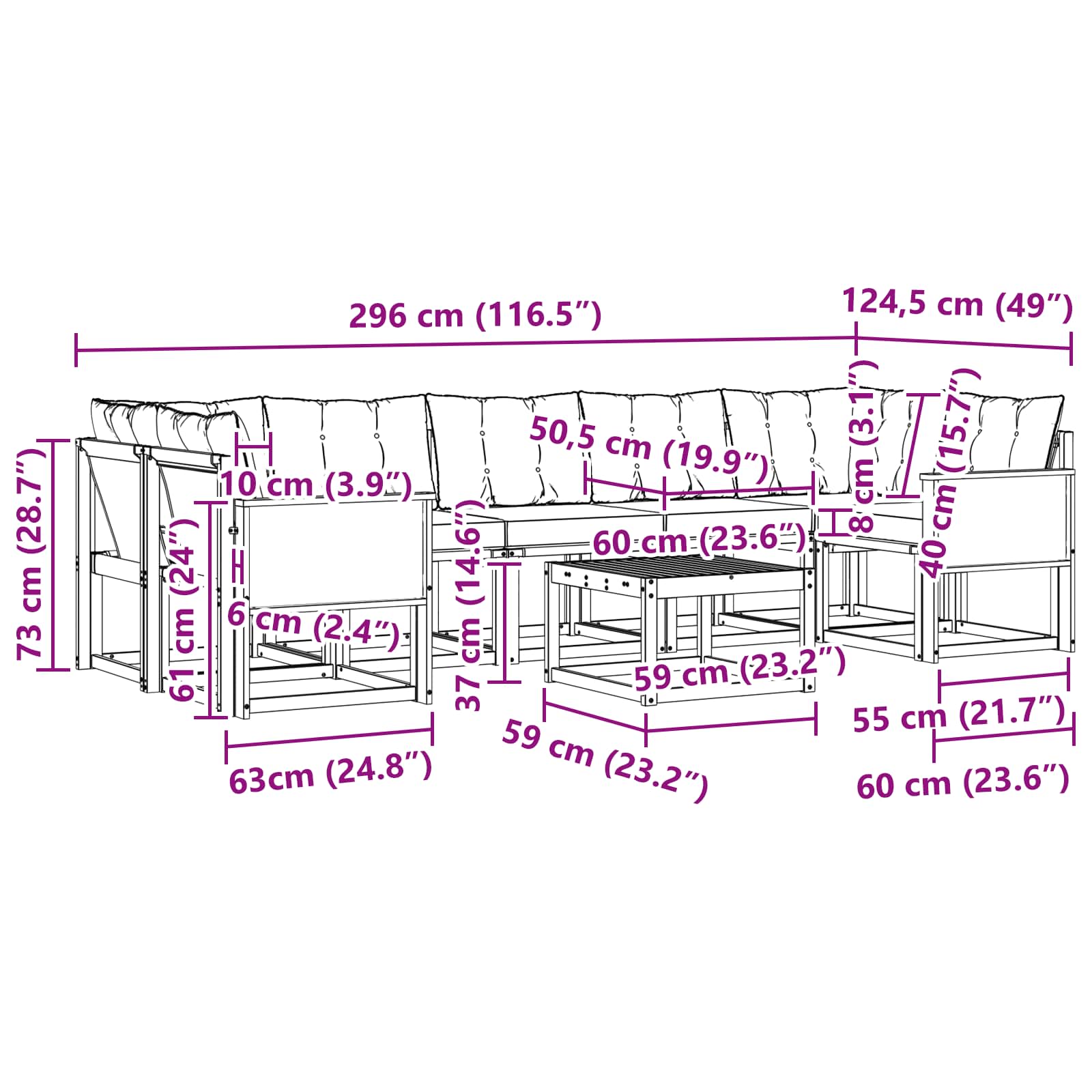 - 5 x Srednji kavč: 59 x 63 x 73 cm (D x Š x V)