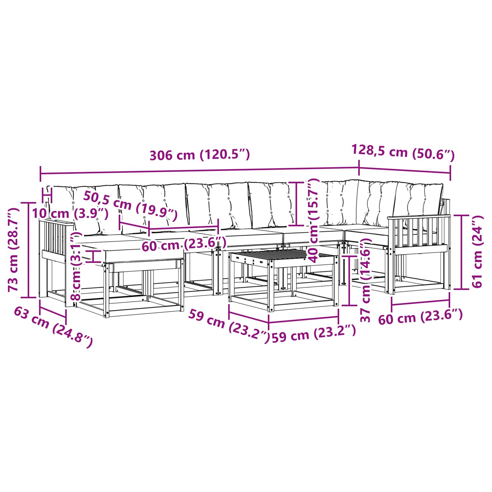 - 5 x Srednja sofa: 59 x 63 x 73 cm (D x Š x V)