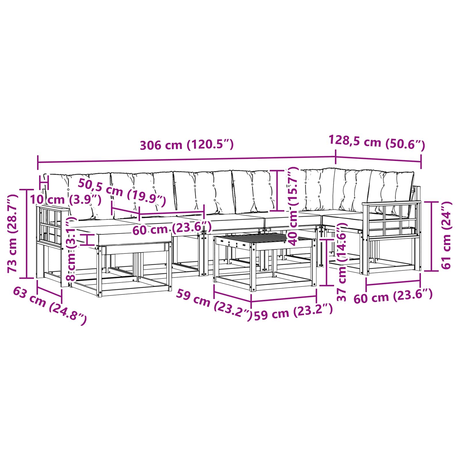 - 5 x Srednja sofa: 59 x 63 x 73 cm (D x Š x V)