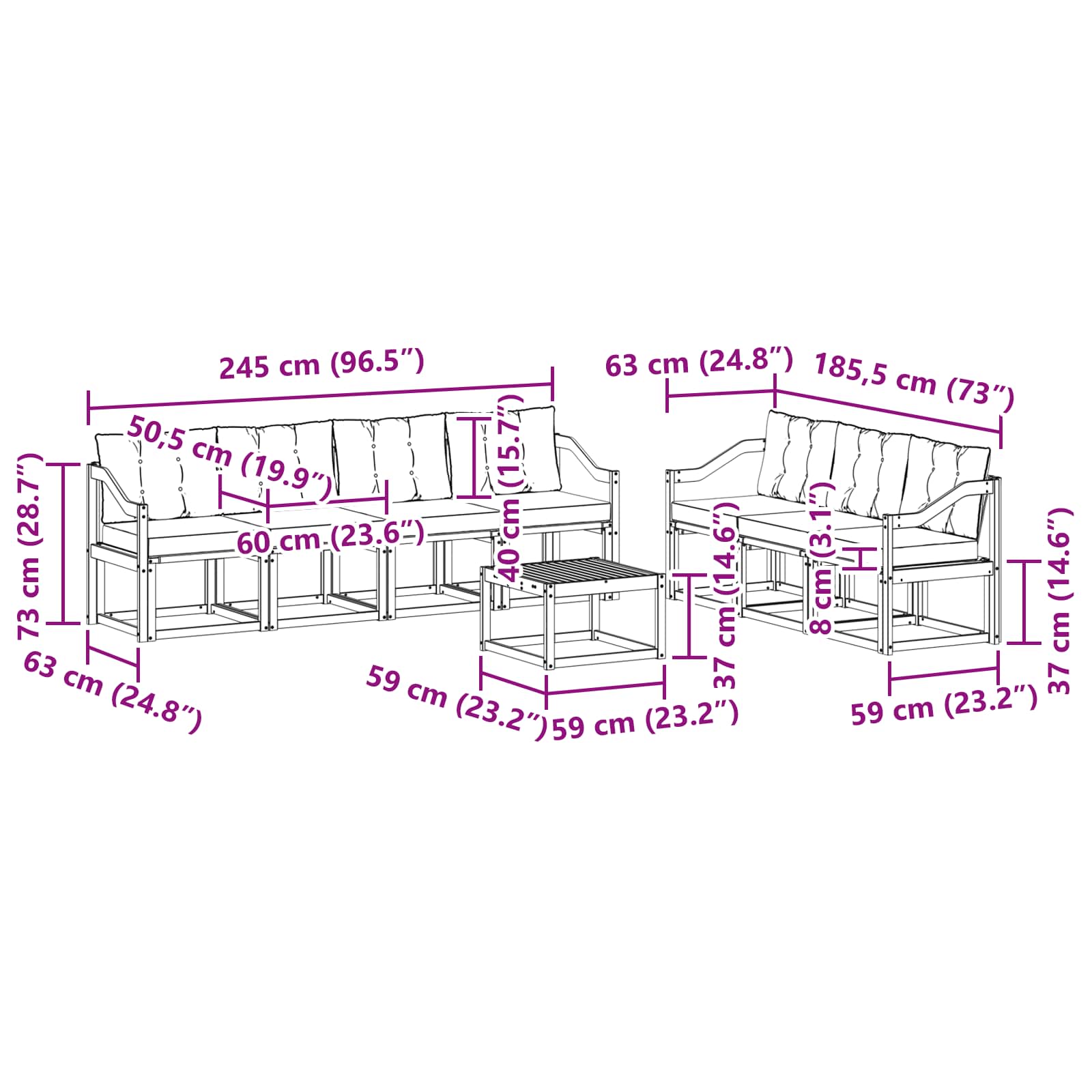 - 7 x Srednji kavč: 59 x 63 x 73 cm (D x Š x V)