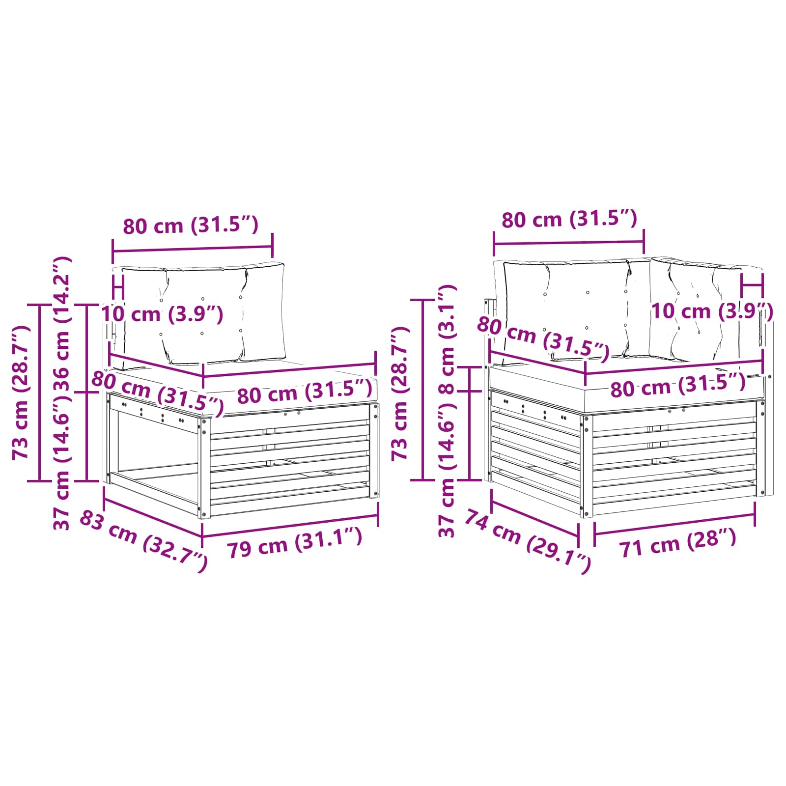 - 7 x srednji kavč: 79 x 83 x 73 cm (D x Š x V)
